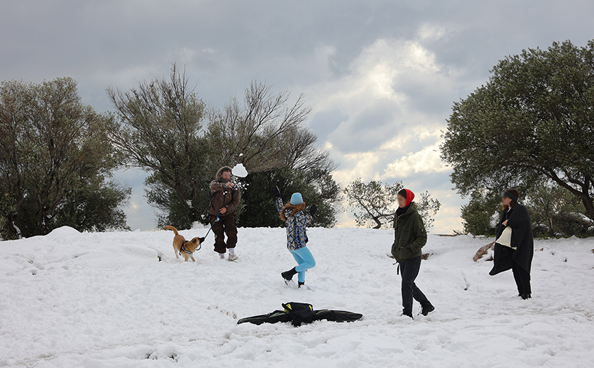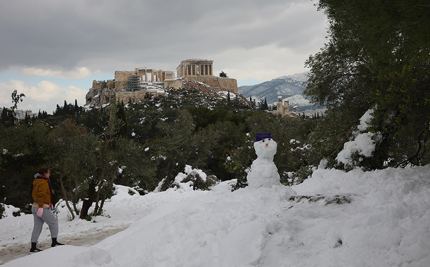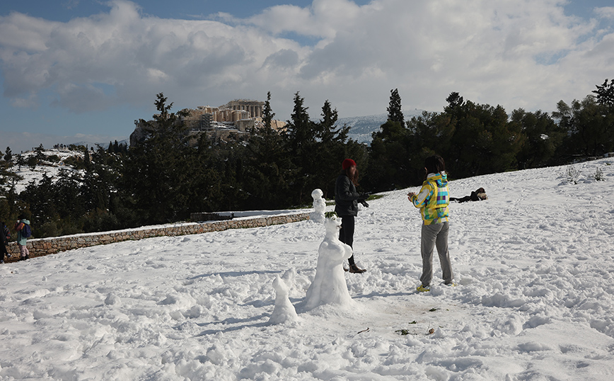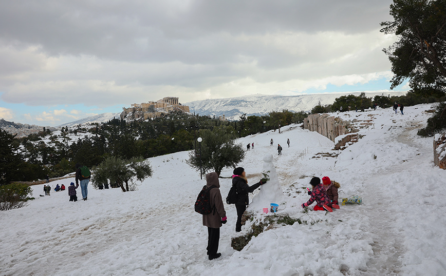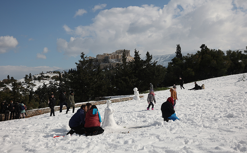 Ο λόφος του Φιλοππάπου θύμιζε σήμερα… πίστα του σκι, ενώ κόσμος έσπευσε στο σημείο για να παίξει με το χιόνι και να φτιάξει χιοναθρώπους με φόντο την Ακρόπολη.