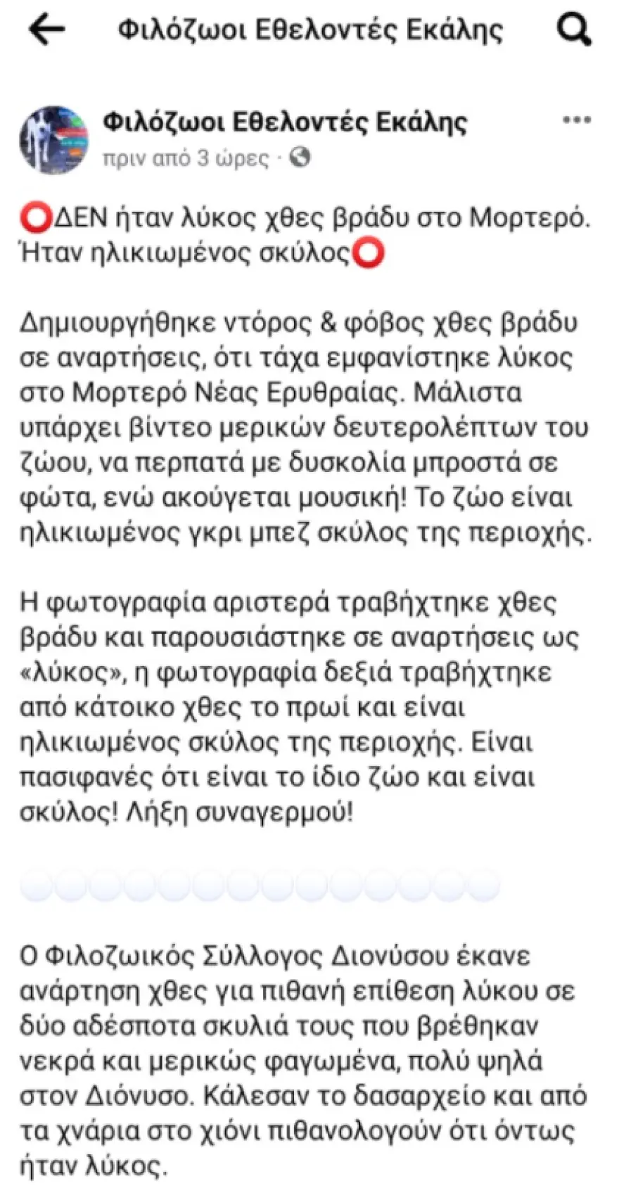 Συγκεκριμένα, η φωτογραφία που κυκλοφορούσε ήταν από έναν ηλικιωμένο σκύλο προκάλεσε πανικό και σε αρκετές τοπικές σελίδες στα μέσα κοινωνικής δικτύωσης τον συνέδεσαν με τις επιθέσεις κατά σκύλων στον Διόνυσο, οι οποίοι κατά πάσα πιθανότητα συνδέονται με κοπάδι λύκων.