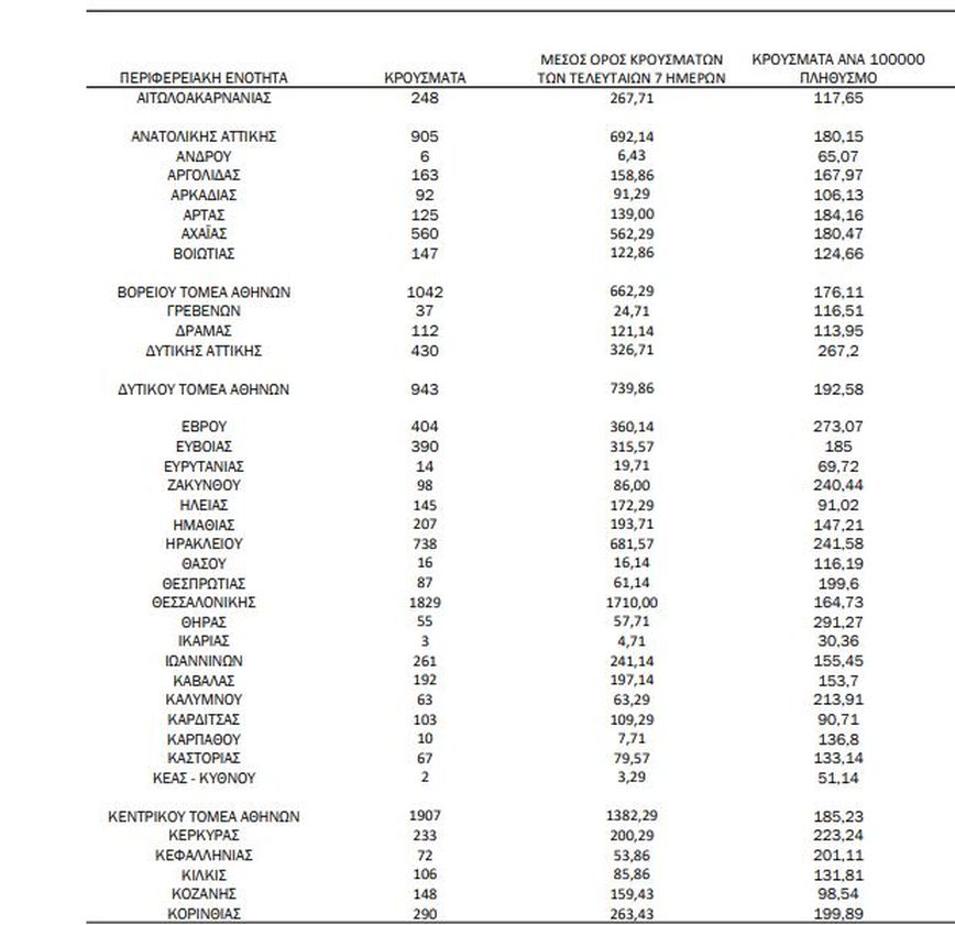 Από τα 19.584 νέα κρούσματα που καταγράφηκαν συνολικά σε όλη την Ελλάδα, τα 7.095 είναι στην Αττική και τα 1.829 στη Θεσσαλονίκη, ενώ στην Κρήτη συνολικά καταγράφονται 1.624 κρούσματα.