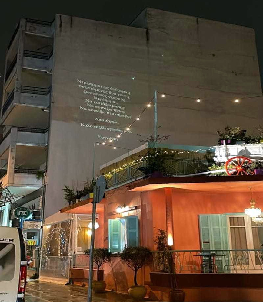 Το εστιατόριο «Λατέρνα» στην περιοχή Χαριλάου συγκινεί με το μήνυμα που πρόβαλε μέσω προζέκτορα από την ταράτσα της διπλανής πολυκατοικίας