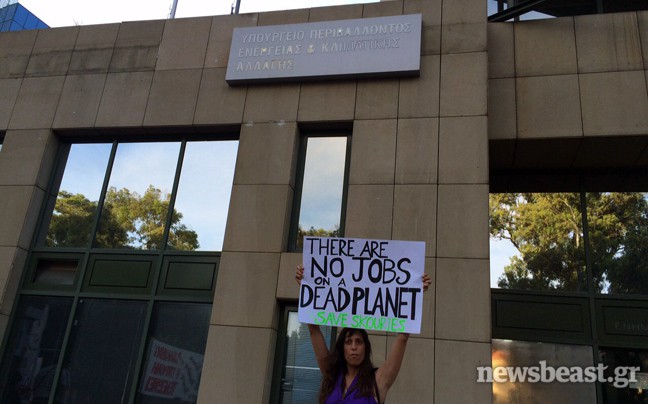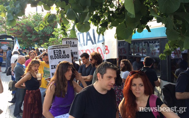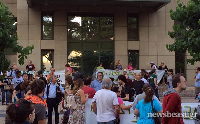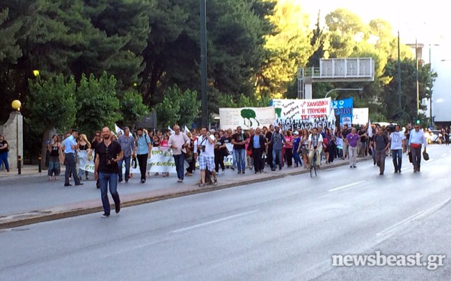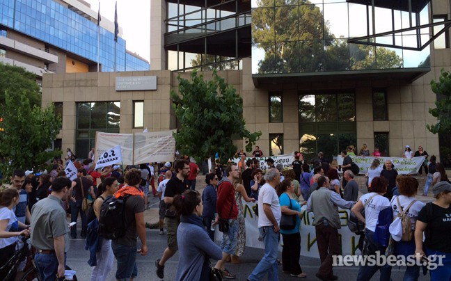 Έξω από το υπ. Περιβάλλοντος έφτασε η πορεία των διαμαρτυρόμενων για την εξόρυξη χρυσού στις Σκουριές.