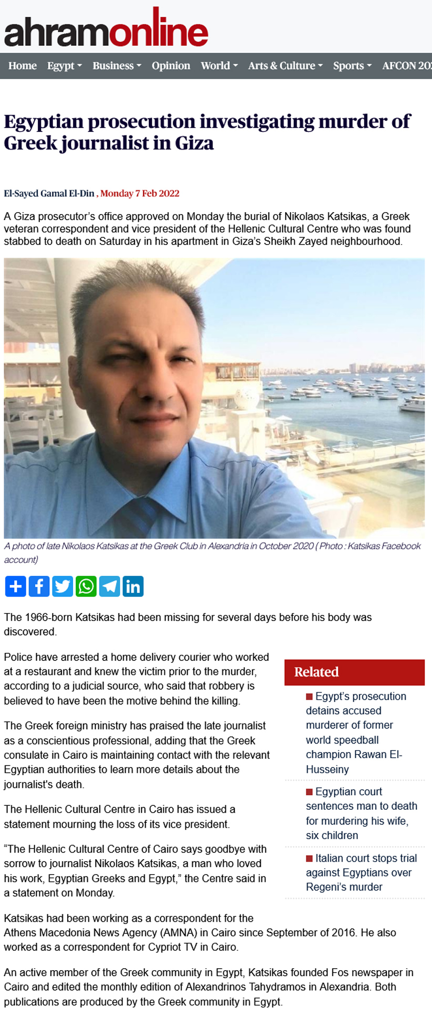 Στα χέρια της Αστυνομίας της Αιγύπτου βρίσκεται ένας διανομέας που φέρεται να βρίσκεται πίσω από τη δολοφονία του ανταποκριτή του Αθηναϊκού-Μακεδονικού Πρακτορείου Ειδήσεων στο Κάιρο, Νίκου Κάτσικα. Σύμφωνα με την εφημερίδα Αl-Ahram ο διανομέας γνώριζε το θύμα πριν το φόνο και οι Αρχές βλέπουν τη ληστεία ως κίνητρο.