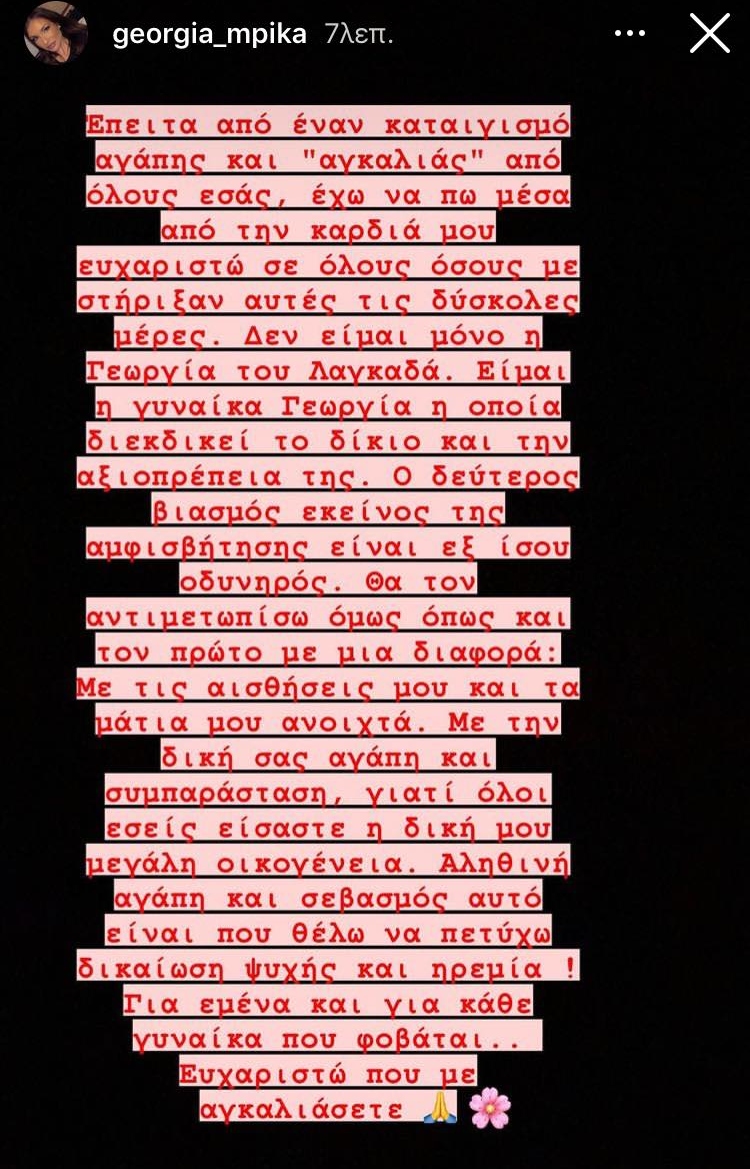 Η Γεωργία ευχαριστεί όσους την έχουν στηρίξει αυτές τις δύσκολες ώρες και σημειώνει πως «ο δεύτερος βιασμός, εκείνος της αμφισβήτησης είναι εξίσου οδυνηρός και αυτό που ζητάει είναι η δικαίωση της ψυχής και η ηρεμία για την ίδια και για κάθε γυναίκα που φοβάται.