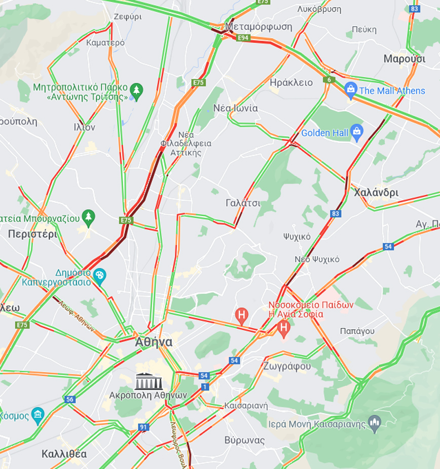 Ο χάρτης της Google με την κίνηση στους δρόμους