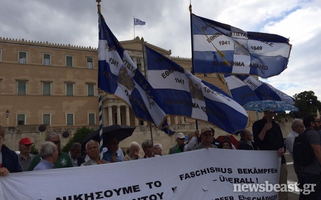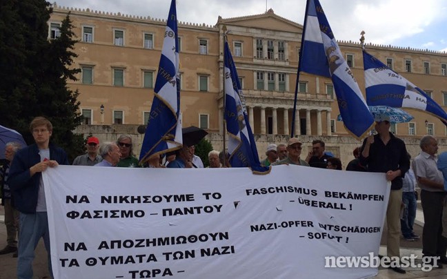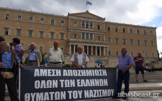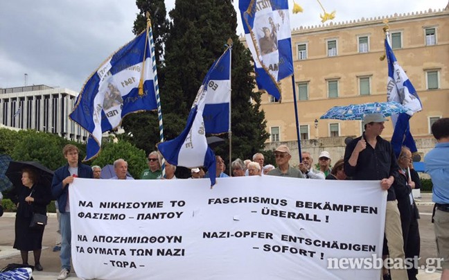 «Άμεση αποζημίωση όλων των Ελλήνων θυμάτων του ναζισμού» αναγράφεται μεταξύ άλλων στα πανό που κρατούν οι διαδηλωτές.