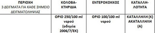 Στους παρακάτω πίνακες, μπορεί κανείς να δει τόσο την καταλληλότητα όσο και την καθαρότητα των παραλιών της Αττικής, του Ευβοϊκού και του Κορινθιακού, καθώς παρατίθενται αναλυτικά και οι τιμές για τα κολοβακτηρίδια και τον εντερόκοκκο ανά όγκο νερού.