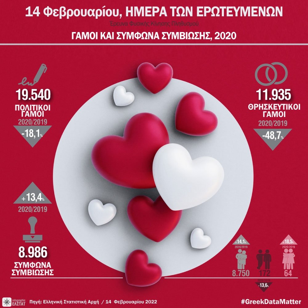 Με αφορμή την ημέρα του Αγίου Βαλεντίνου, η ΕΛΣΤΑΤ παρουσίασε τα στατιστικά στοιχεία των θρησκευτικών και πολιτικών γάμων που καταγράφηκαν στη διάρκεια του 2020 στην Ελλάδα καθώς και το τί συνέβη με τα σύμφωνα συμβίωσης.