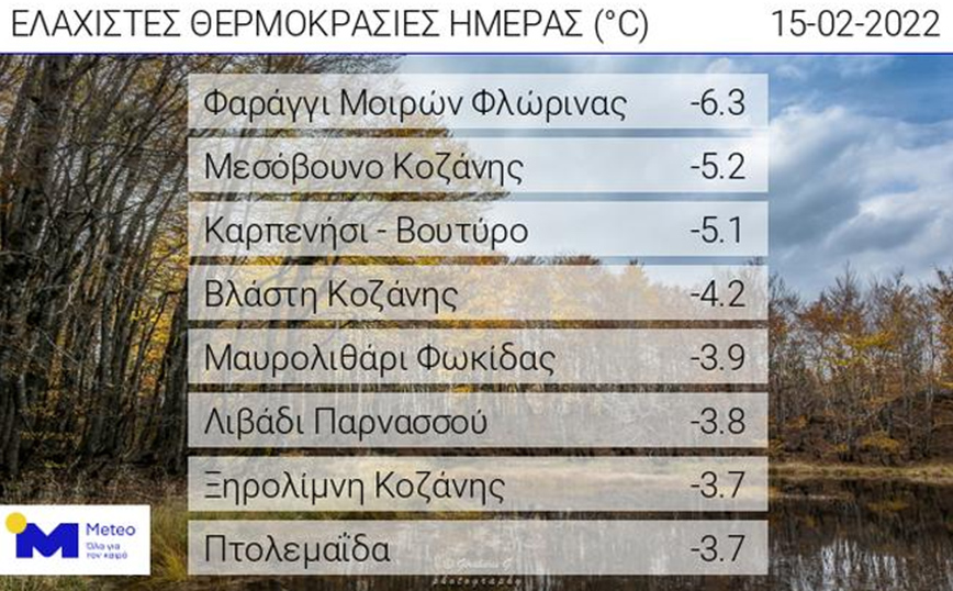 Οι επόμενες χαμηλότερες ελάχιστες θερμοκρασίες μετά το Φαράγγι Μοιρών Φλώρινας καταγράφηκαν σε Μεσόβουνο Κοζάνης (-5,2), Βουτύρο Καρπενησίου (-5,1), Βλάστη Κοζάνης (-4,2), Μαυρολιθάρι Φωκίδας (-3,9) και Λιβάδι Παρνασσού (-3,8).