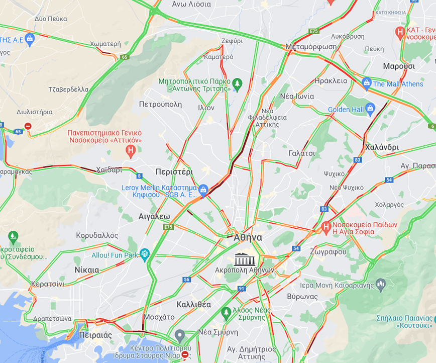 Δείτε τον χάρτη της Google με την κίνηση αυτή την ώρα στην Αθήνα: