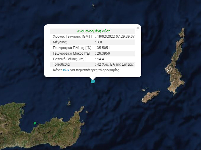 Σεισμός μεγέθους 3,8 Ρίχτερ σημειώθηκε το πρωί του Σαββάτου στην Κρήτη και πιο συγκεκριμένα 42 χλμ βορειοανατολικά της Σητείας.