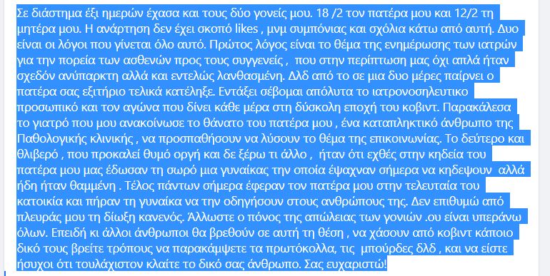«Σε διάστημα έξι ημερών έχασα και τους δύο γονείς μου. 18 /2 τον πατέρα μου και 12/2 τη μητέρα μου. Η ανάρτηση δεν έχει σκοπό likes , μνμ συμπόνιας και σχόλια κάτω από αυτή. Δυο είναι οι λόγοι που γίνεται όλο αυτό. Πρώτος λόγος είναι το θέμα της ενημέρωσης των ιατρών για την πορεία των ασθενών προς τους συγγενείς , που στην περίπτωση μας όχι απλά ήταν σχεδόν ανύπαρκτη αλλά και εντελώς λανθασμένη. Δλδ από το σε μια δυο μέρες παίρνει ο πατέρςα σας εξιτήριο τελικά κατέληξε. Εντάξει σέβομαι απόλυτα το ιατρονοσηλευτικο προσωπικό και τον αγώνα που δίνει κάθε μέρα στη δύσκολη εποχή του κοβιντ. Παρακάλεσα το γιατρό που μου ανακοίνωσε το θάνατο του πατέρα μου , ένα καταπληκτικό άνθρωπο της Παθολογικής κλινικής , να προσπαθήσουν να λύσουν το θέμα της επικοινωνίας. Το δεύτερο και θλιβερό , που προκαλεί θυμό οργή και δε ξέρω τι άλλο, ήταν ότι εχθές στην κηδεία του πατέρα μου μας έδωσαν τη σορό μια γυναίκας την οποία έψαχναν σήμερα να κηδέψουν αλλά ήδη ήταν θαμμένη. Τέλος πάντων σήμερα έφεραν τον πατέρα μου στην τελευταία του κατοικία και πήραν τη γυναίκα να την οδηγήσουν στους ανθρώπους της. Δεν επιθυμώ από πλευράς μου τη δίωξη κανενός. Άλλωστε ο πόνος της απώλειας των γονιών μου είναι υπεράνω όλων. Επειδή κι άλλοι άνθρωποι θα βρεθούν σε αυτή τη θέση , να χάσουν από κοβιντ κάποιο δικό τους βρείτε τρόπους να παρακάμψετε τα πρωτόκολλα, τις μπούρδες δλδ , και να είστε ήσυχοι ότι τουλάχιστον κλαίτε το δικό σας άνθρωπο. Σας ευχαριστώ!».