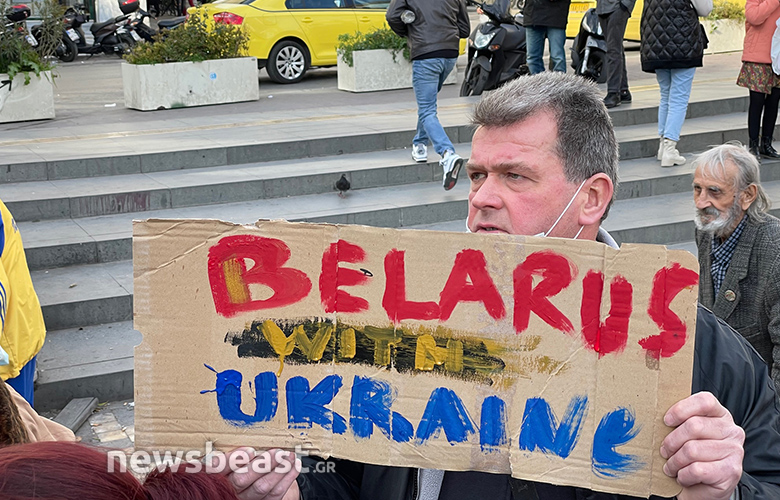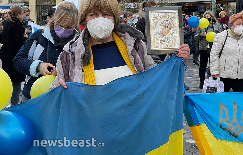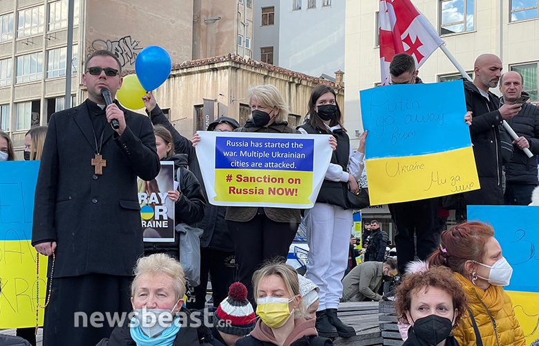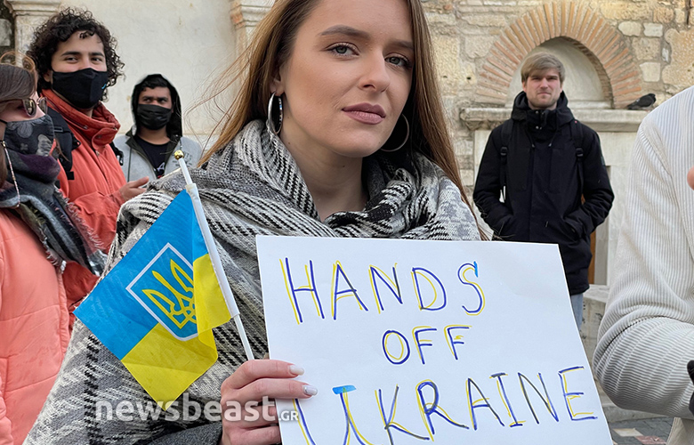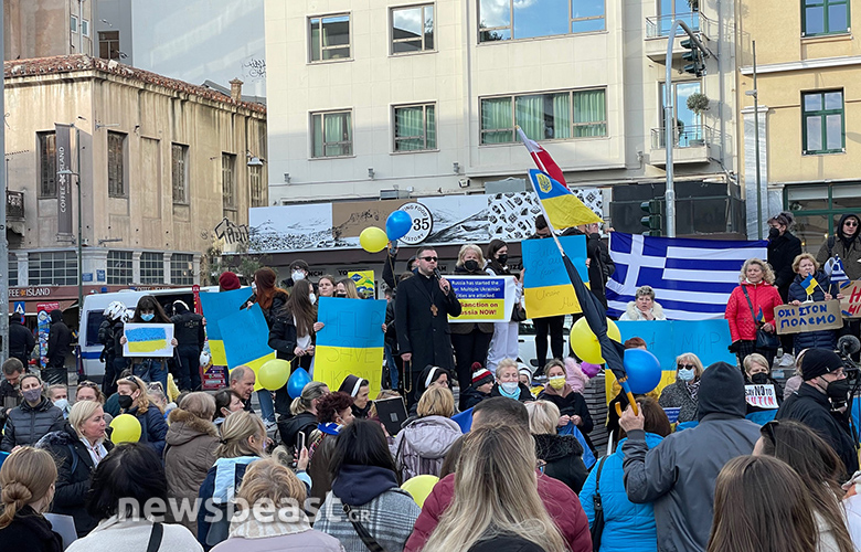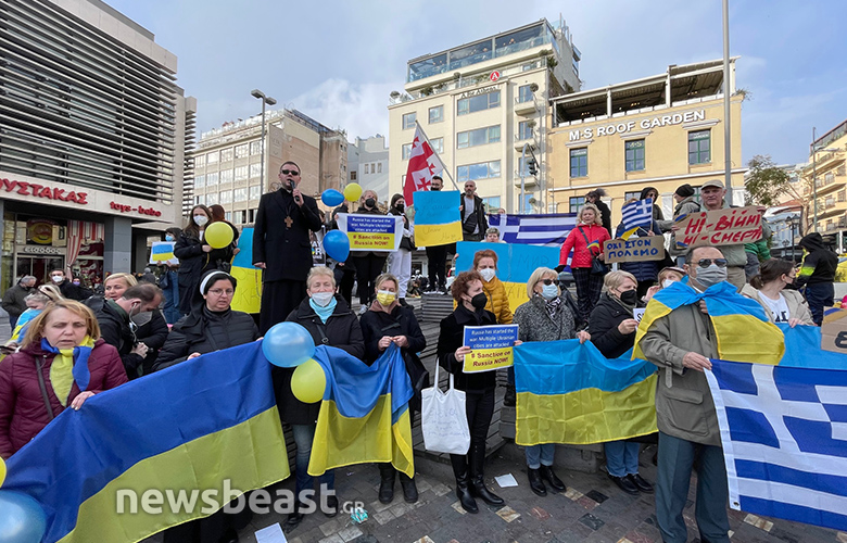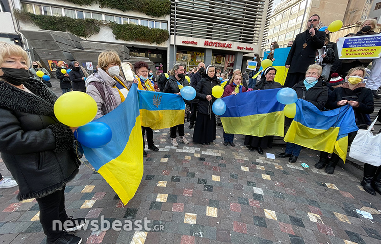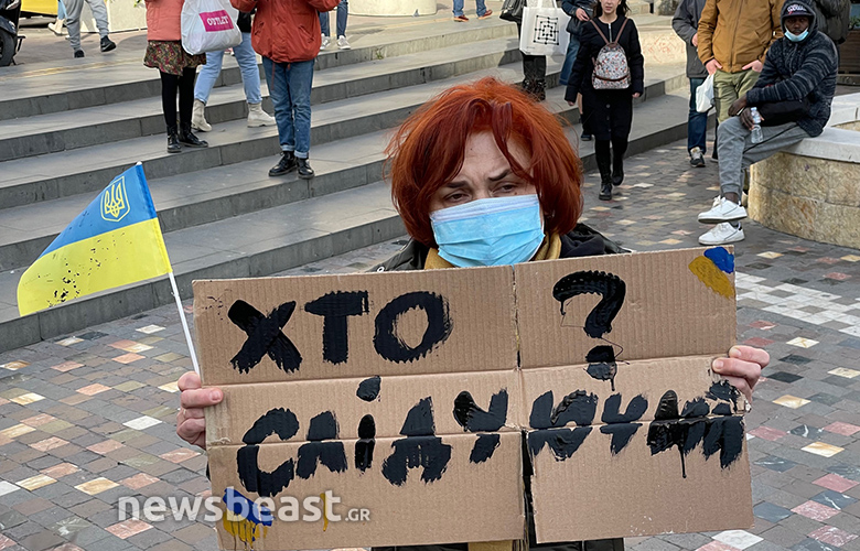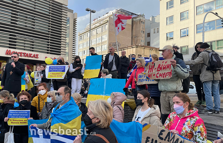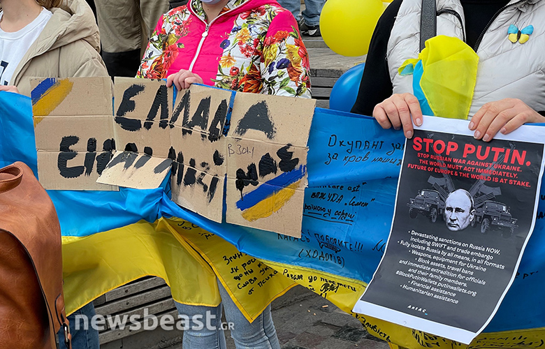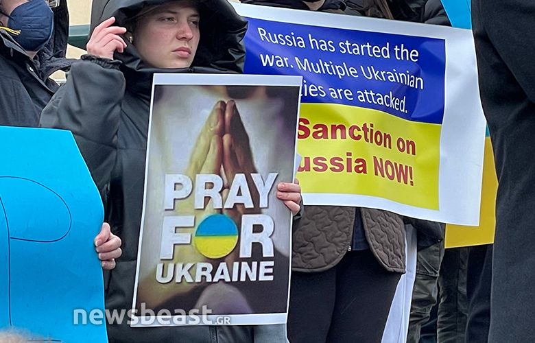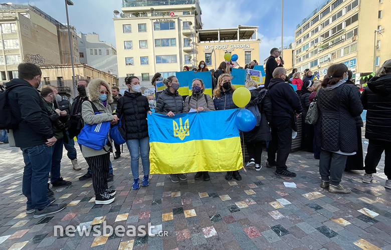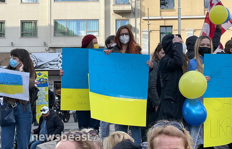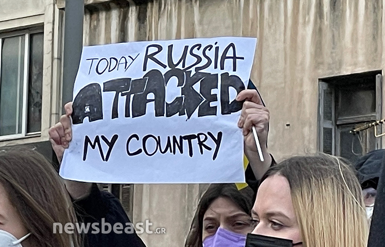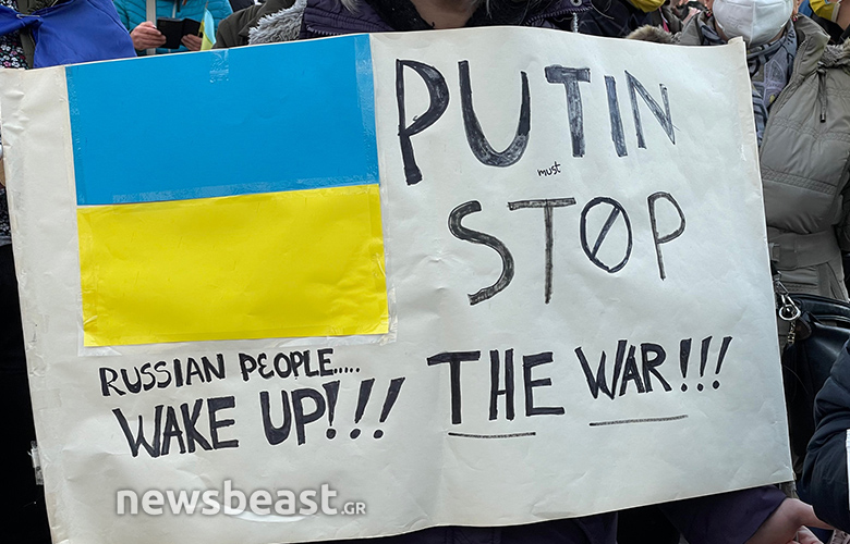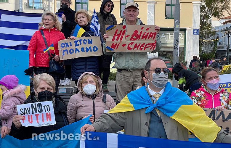 Οι Ουκρανοί πολίτες που συγκεντρώθηκαν κρατούν πλακάτ με συνθήματα κατά του πολέμου, αλλά και κατά του Βλαντιμίρ Πούτιν, όπως και σημαίες της Ουκρανίας και της Ελλάδας.