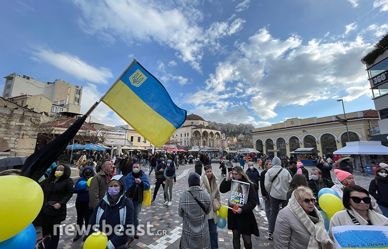 Στο Μοναστηράκι συγκεντρώθηκαν Ουκρανοί πολίτες διαδηλώνοντας κατά της ρωσικής εισβολής στην Ουκρανία που ξεκίνησε από τα ξημερώματα της Πέμπτης (24/2) με την επίθεση στη χώρα να είναι ολομέτωπη.