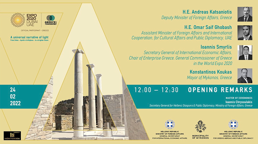 Το Υπουργείο Εξωτερικών με την Enterprise Greece και το Δήμο Μυκόνου διοργάνωσαν την Πέμπτη 24 Φεβρουαρίου 2022 εκδήλωση με τίτλο «A Universal Narrative of Light – From Apollo’s birthplace, Delos, to a brighter future».