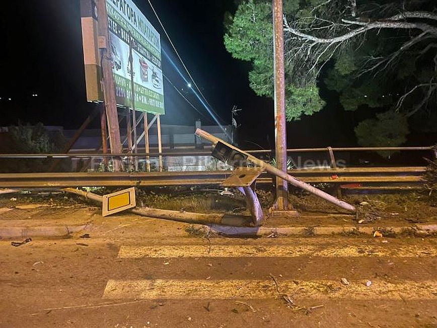 Η Πυροσβεστική έκοψε την μια κολώνα που είχε πέσει στη μέση του δρόμου για να μην τραυματιστεί κάποιος διερχόμενος. Στο σημείο βρέθηκε αμέσως και όχημα του ΔΕΔΔΗΕ αλλά και ασθενοφόρο που τελικά δεν διεκόμισε τον οδηγό σε νοσοκομείο αφού υπέγραψε ότι είναι καλά.