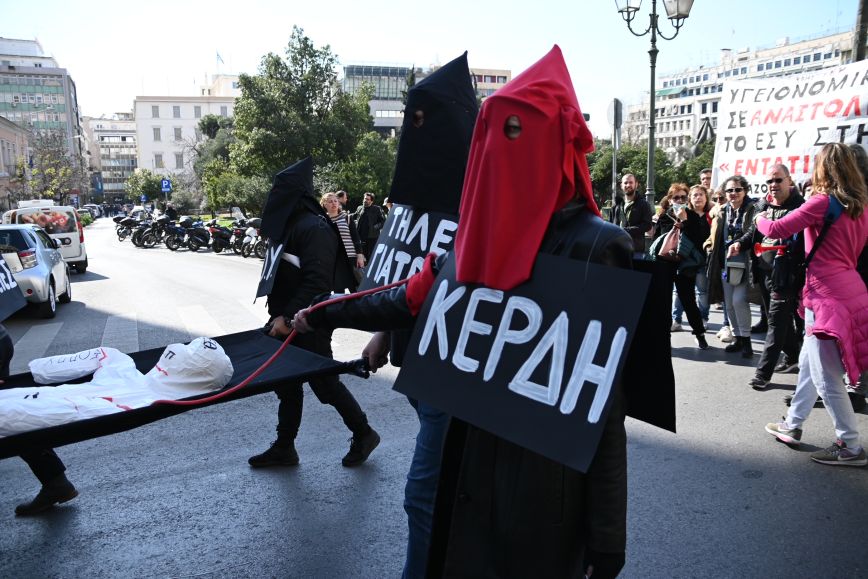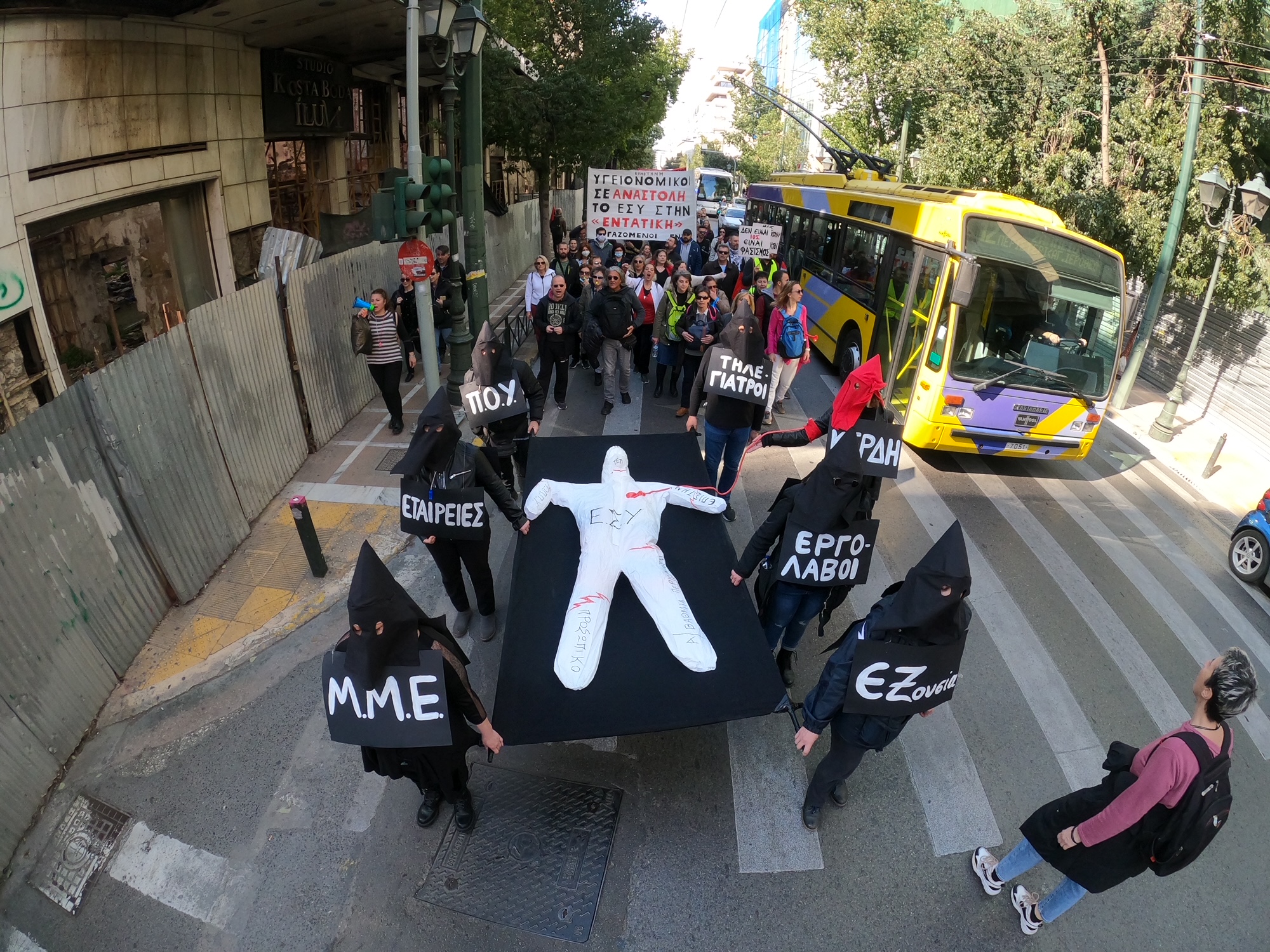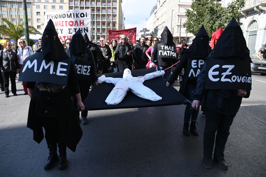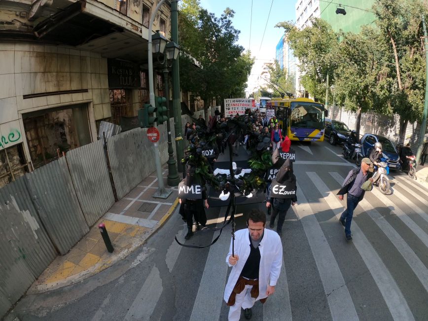 Περίπου 200 άτομα ανέβηκαν τη Σταδίου από μία λωρίδα κυκλοφορίας έχοντας σε μια μαύρη σημαία τον «ασθενή» ΕΣΥ.