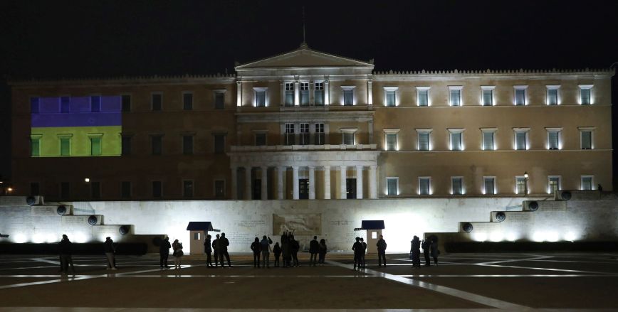 Με τη σημαία της Ουκρανίας φωταγωγείται απόψε η πρόσοψη του Μεγάρου της Βουλής των Ελλήνων, πάνω από το Μνημείο του Άγνωστου Στρατιώτη έως τα μεσάνυχτα.