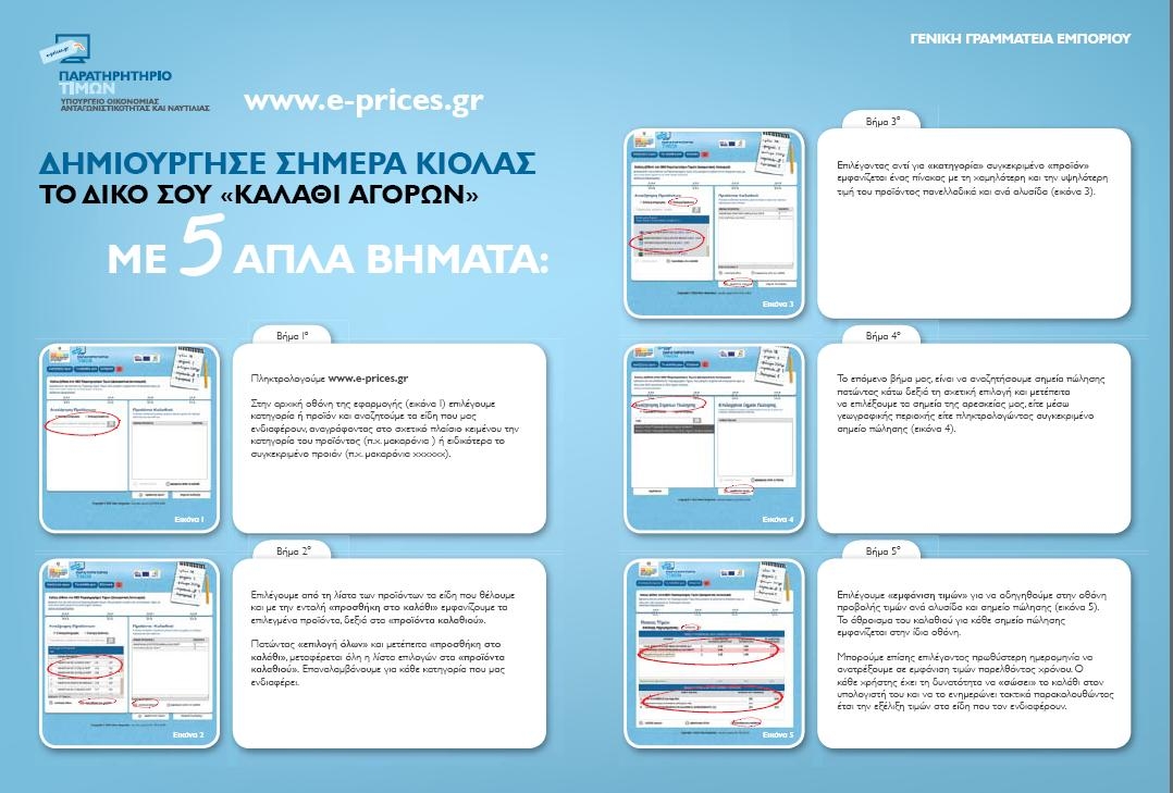-Το παρατηρητήριο τιμών προϊόντων στα σούπερ μάρκετ λειτουργεί στην ιστοσελίδα www.e-prices.gr και παρέχει τη δυνατότητα παρακολούθησης και σύγκρισης των τιμών πώλησης, για πάνω από 1.500 προϊόντα σε 1.200 σημεία πώλησης, σε 13 Περιφέρειες, σε 1-4 πόλεις ανά Περιφέρεια. Το νέο αυτό εργαλείο αποτελεί έναν μοναδικό, αυτοματοποιημένο μηχανισμό συλλογής, επεξεργασίας και παρουσίασης τιμών διαφόρων προϊόντων από ολόκληρη την Ελλάδα.