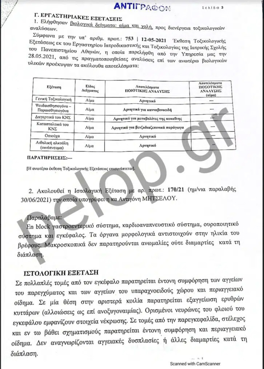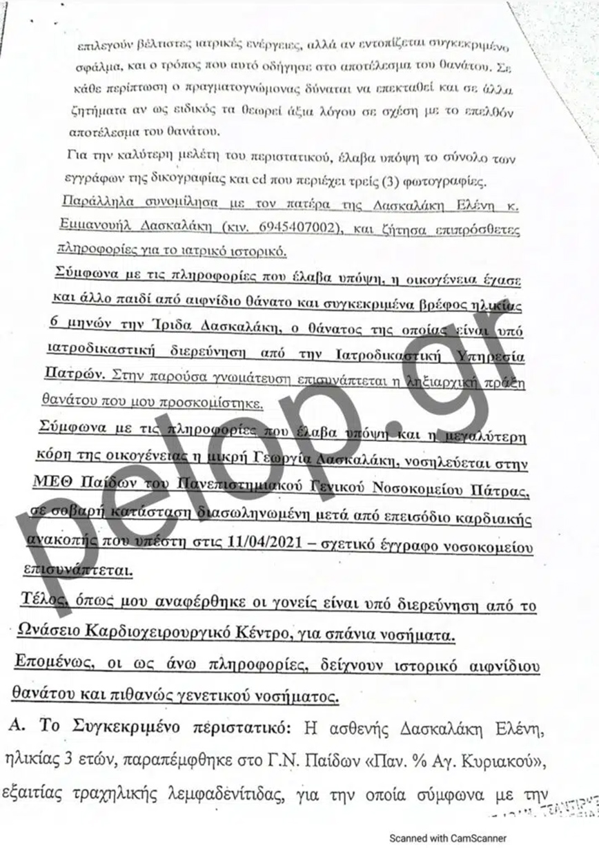 Τα έγγραφα που φέρνει στο φως η εφημερίδα Πελοπόννησος, είναι η ιατροδικαστική έκθεση της ιατροδικαστού Αγγελικής Τσιόλα για την Ίριδα και η πραγματογνωμοσύνη του ιατροδικαστή Σωκράτη Τσαντίρη για την Μαλένα. Στο μεταξύ είναι σε εξέλιξη πιο εξειδικευμένες εξετάσεις και για τα τρία παιδιά, ενώ το Τμήμα Ανθρωποκτονιών επεξεργάζεται και συσχετίζει νέα στοιχεία που έχουν χρονική αλληλουχία με τη νοσηλεία των τριών κοριτσιών και από τα οποία έχουν προκύψει στοιχεία προς διερεύνηση.