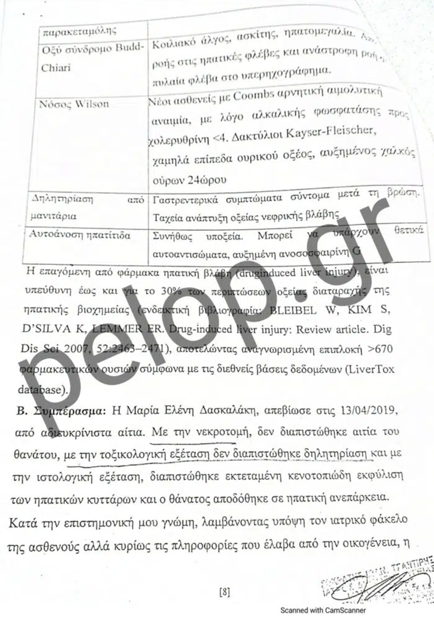 Στο πόρισμα για την Μαλένα αναφέρεται ότι: «Η Μαρία Ελένη Δασκαλάκη απεβίωσε στις 13/4/2019 από αδιευκρίνιστα αίτια. Με την νεκροτομή δεν διαπιστώθηκε προφανή αιτία θανάτου, με την τοξικολογική εξέταση δεν διαπιστώθηκε δηλητηρίαση και με την ιστολογική εξέταση διαπιστώθηκε εκτεταμένη κενοτοπιώδη εκφύλιση των ηπατικών κυττάρων και ο θάνατος αποδόθηκε σε ηπατική ανεπάρκεια».