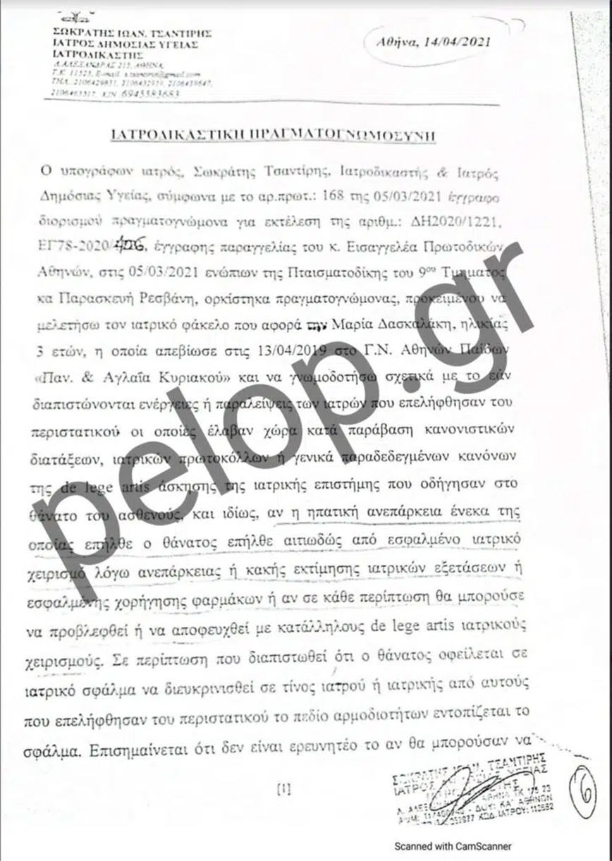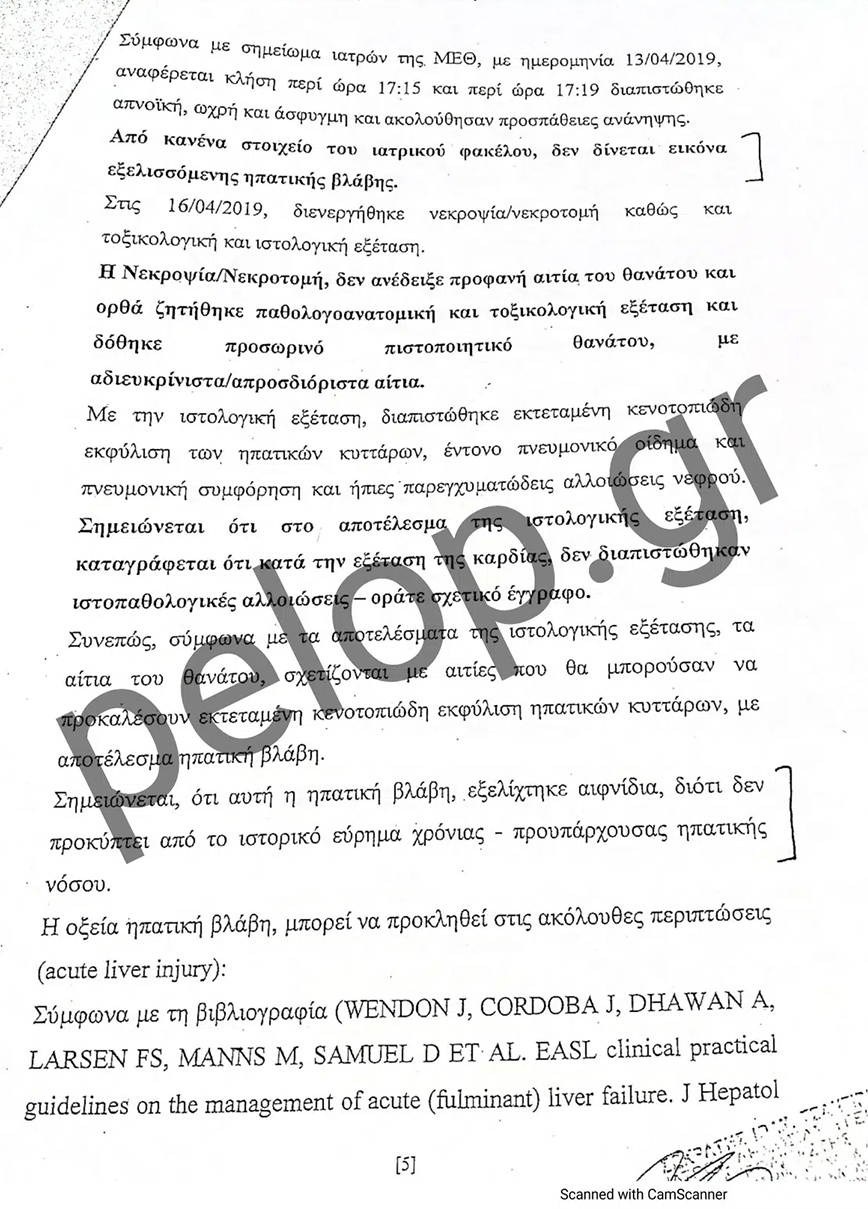 Σε άλλο σημείο του πορίσματος αναφέρεται, ότι με βάση τα στοιχεία που τέθηκαν στην διάθεσή του, ο θάνατος του παιδιού σχετίζεται με αιτίες που περιγράφονται παραπάνω. Σημειώνει δε, ότι αυτή η ηπατική βλάβη εξελίχθηκε αιφνίδια, διότι δεν προκύπτει από το ιστορικό εύρημα χρόνια – προϋπάρχουσα ηπατική νόσος.