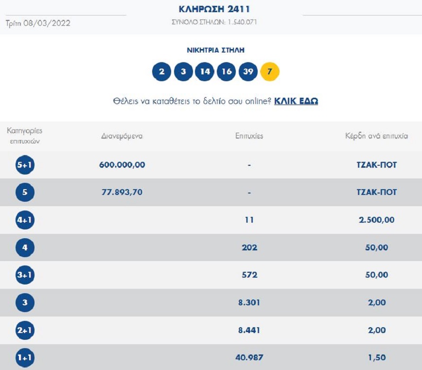 Οι τυχεροί αριθμοί στη σημερινή κλήρωση Τζόκερ είναι οι εξής 2, 3, 14, 16, 39 και Τζόκερ το 7.