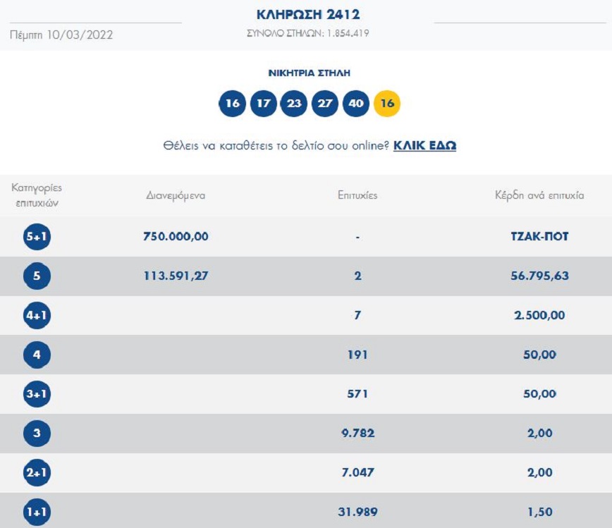 Σήμερα, Πέμπτη 10 Μαρτίου 2022, στην κλήρωση 2412 Τζόκερ του ΟΠΑΠ, θα μοιραστούν στους τυχερούς της πρώτης κατηγορίας τουλάχιστον 750.000 ευρώ.