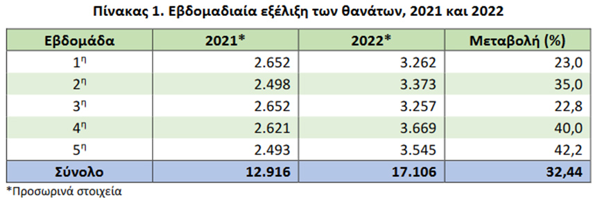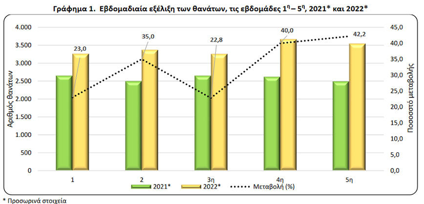 Κατά 32,44% ή κατά 4.190 θανάτους αυξήθηκαν οι θάνατοι στην Ελλάδα (συμπεριλαμβανομένων αυτών λόγω της πανδημίας) τις 5 πρώτες εβδομάδες του 2022 (3/1/2022- 6/2/2022) και ανήλθαν σε 17.106 (8.534 άνδρες και 8.572 γυναίκες). Το αντίστοιχο διάστημα του 2021 (4/1/2021- 7/2/2021) είχαν ανέλθει σε 12.916 (6.596 άνδρες και 6.320 γυναίκες).
