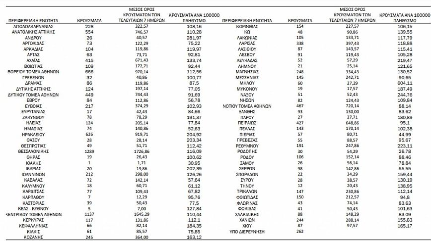 Στην Αττική το τελευταίο 24ωρο καταγράφηκαν 3.906 νέες μολύνσεις. Ακολουθούν η Θεσσαλονίκη με 1.289, το Ηράκλειο με 626 και η Αχαΐα με 415.
