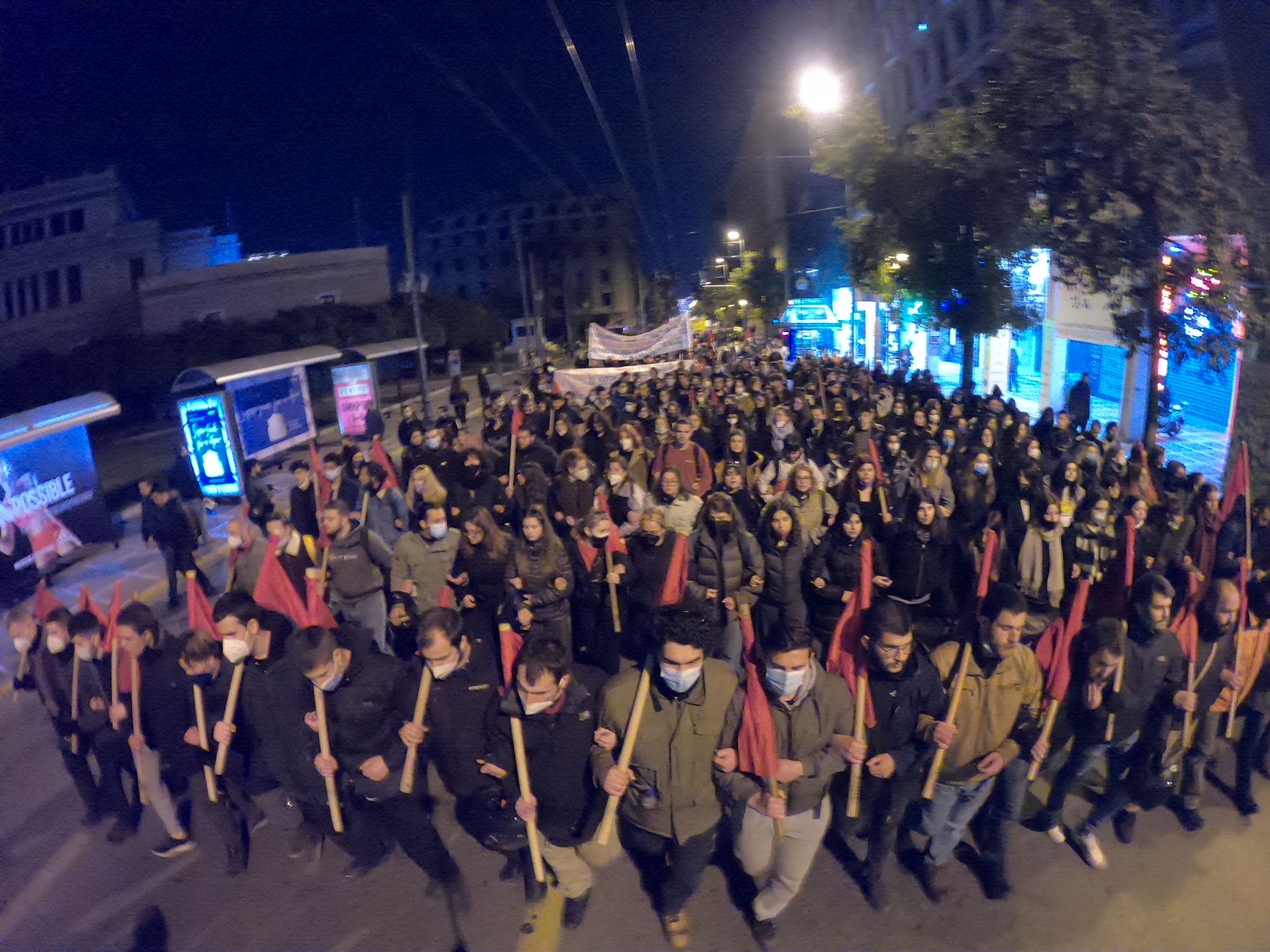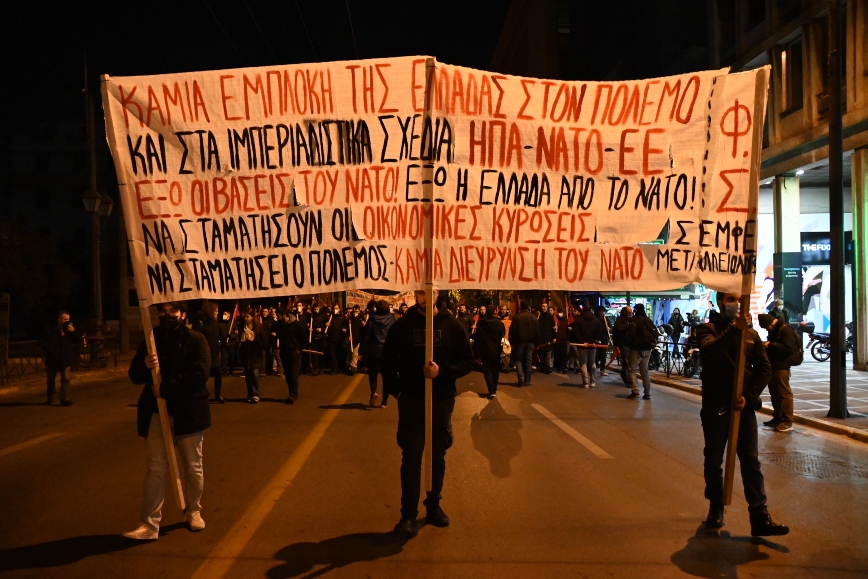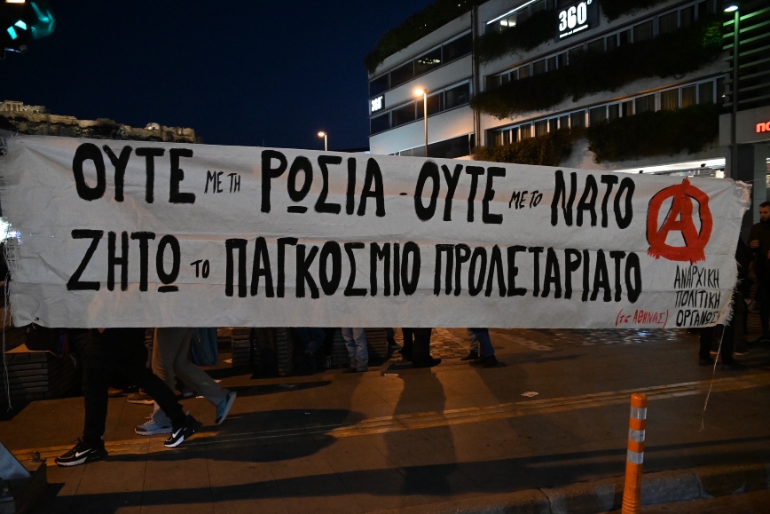 Οι διαδηλωτές φώναξαν συνθήματα για τον πόλεμο στην Ουκρανία. «Ούτε με τη Ρωσία – Ούτε με το ΝΑΤΟ, Ζήτω το Παγκόσμιο Προλεταριάτο», ανέφερε ένα από τα πανό στη διαδήλωση.