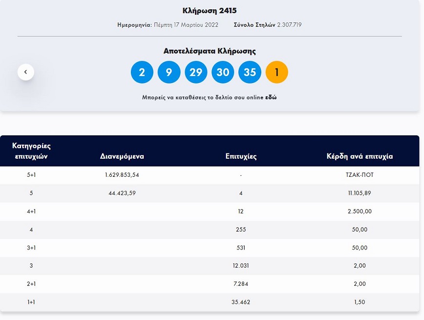 Οι τυχεροί αριθμοί στη σημερινή κλήρωση Τζόκερ είναι οι εξής: 2, 9, 29, 30, 35 και Τζόκερ το 1.