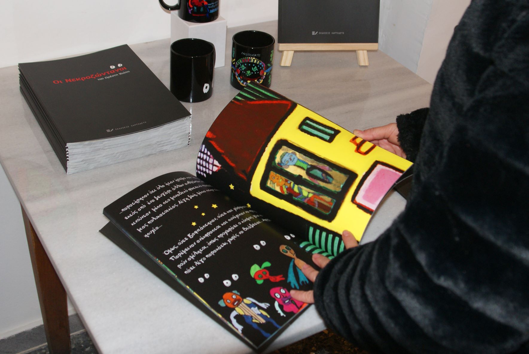 Σε μαύρο φόντο, το αγαπημένο χρώμα του Ορέστη είναι και τυπωμένο και το βιβλίο του «Οι Νεκροζώντανοι» (εκδ. Χαρτόδετο 2021) που παρουσιάζεται το Σάββατο 19 Μαρτίου 2022 στις 12.00 στον χώρο της έκθεσης.