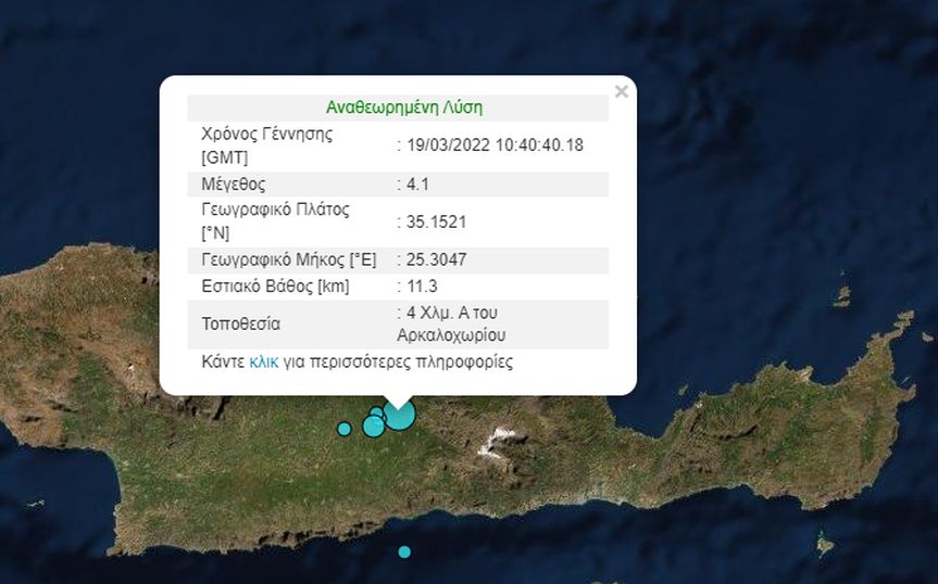 Ο σεισμός έγινε στις 12:40 και σημειώθηκε 4 Χλμ. ανατολικά του Αρκαλοχωρίου, ενώ το εστιακό βάθος υπολογίστηκε στα 11,3 χλμ.