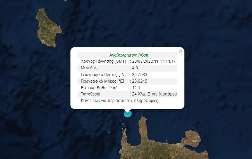 Ο σεισμός έγινε στις 13:49 και σημειώθηκε 27 χλμ. βόρεια της Κισάμου, ενώ το εστιακό βάθος υπολογίστηκε στα 5 χλμ.