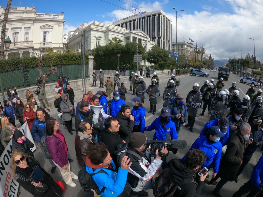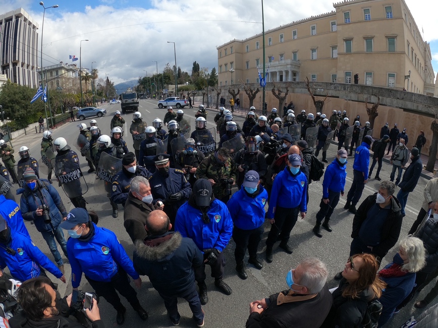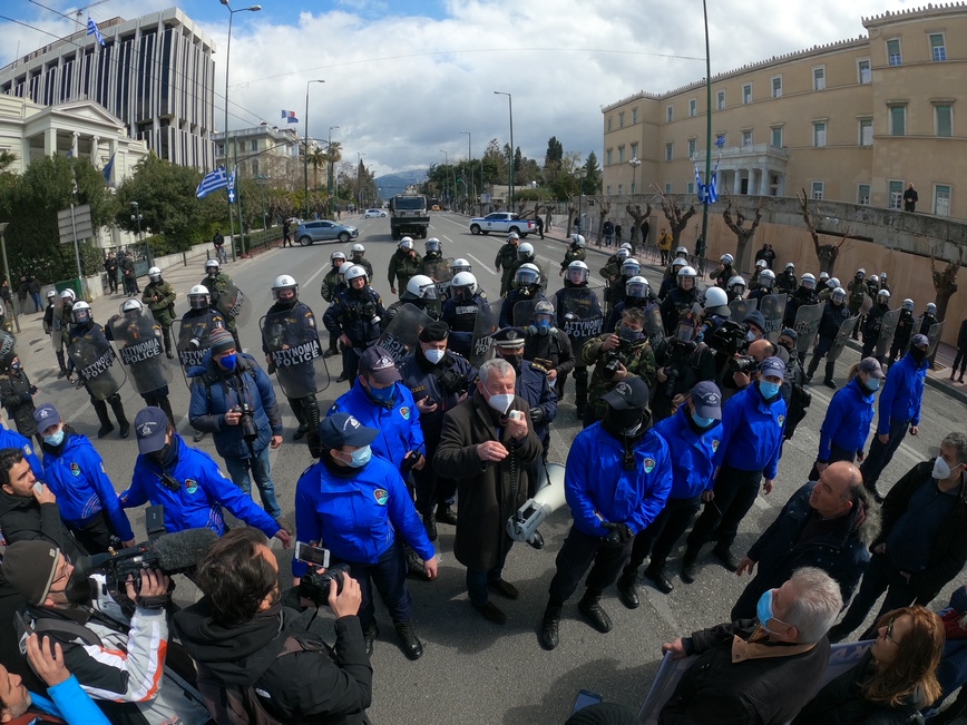 Οι υγειονομικοί προσπάθησαν να προσεγγίσουν το Μέγαρο Μαξίμου για να διαμαρτυρηθούν αλλά οι αστυνομικές δυνάμεις τους εμπόδισαν.
