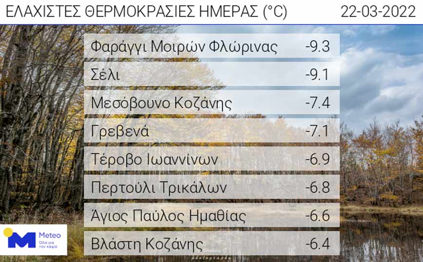 Σύμφωνα με το δίκτυο των αυτόματων μετεωρολογικών σταθμών του Εθνικού Αστεροσκοπείου Αθηνών/meteo.gr, οι χαμηλότερες ελάχιστες θερμοκρασίες καταγράφηκαν στο Φαράγγι Μοιρών Φλώρινας (-9,3 °C), στο Σέλι (-9,1), στο Μεσόβουνο Κοζάνης (-7,4), στα Γρεβενά (-7,1), στο Τέροβο Ιωαννίνων (-6,9), στο Περτούλι Τρικάλων (-6,8) και στον Άγιο Παύλο Ημαθίας (-6,6 βαθμοί).