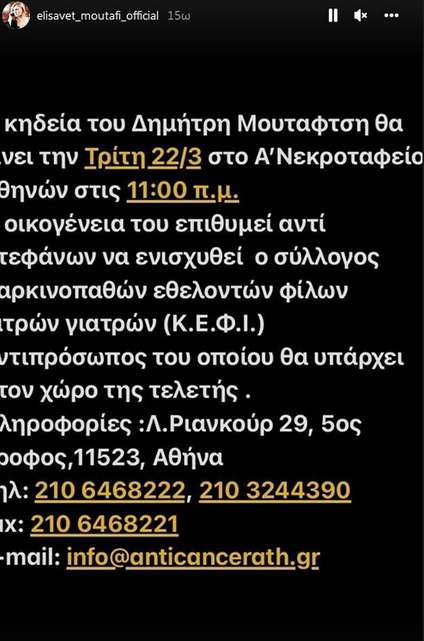 Επιθυμία της οικογένειας, όπως είχε γράψει στο Instagram, ήταν αντί στεφάνων να ενισχυθεί ο Σύλλογος Καρκινοπαθών εθελοντών φίλων γιατρών στη μνήμη του Δημήτρη Μουτάφτση.