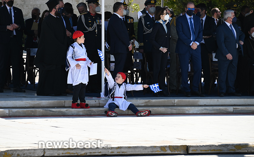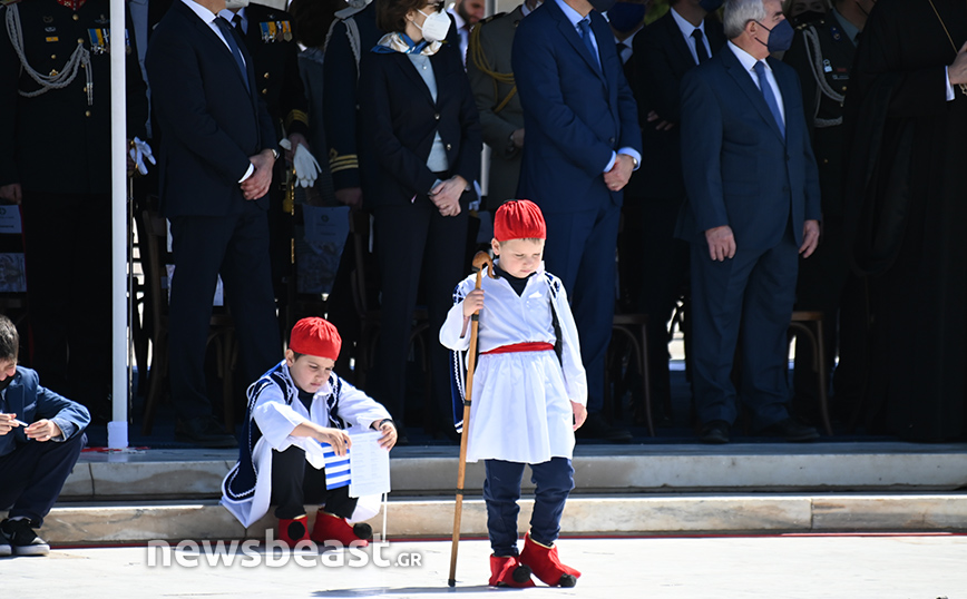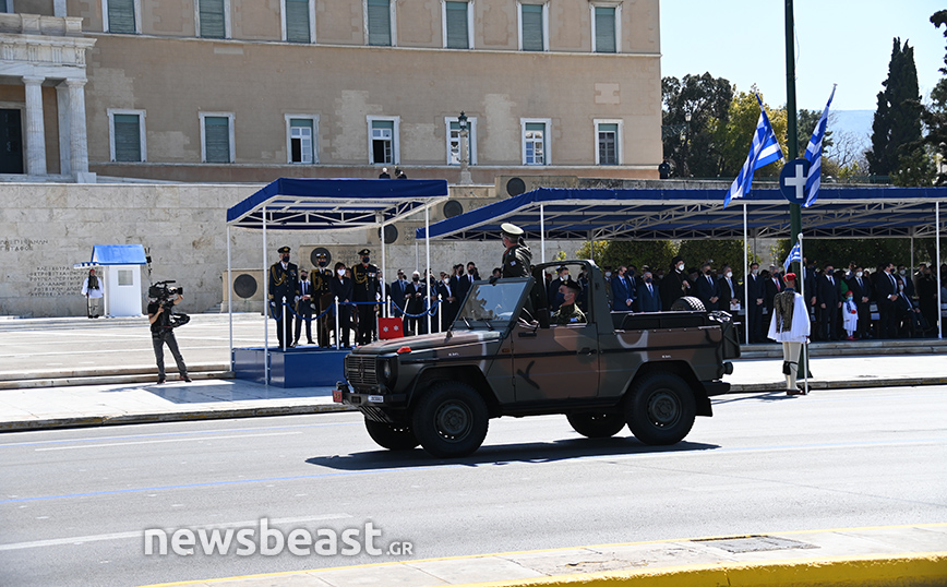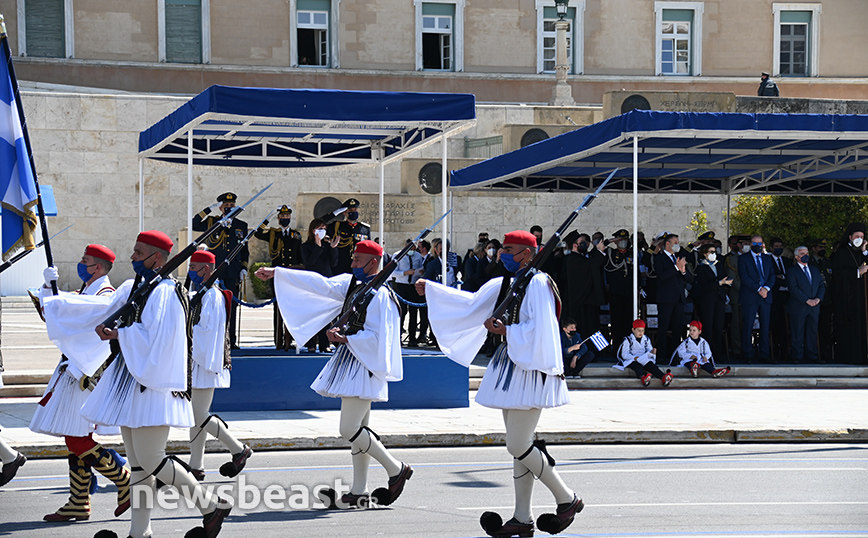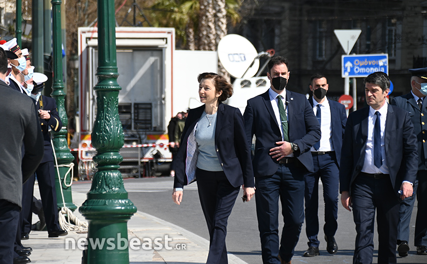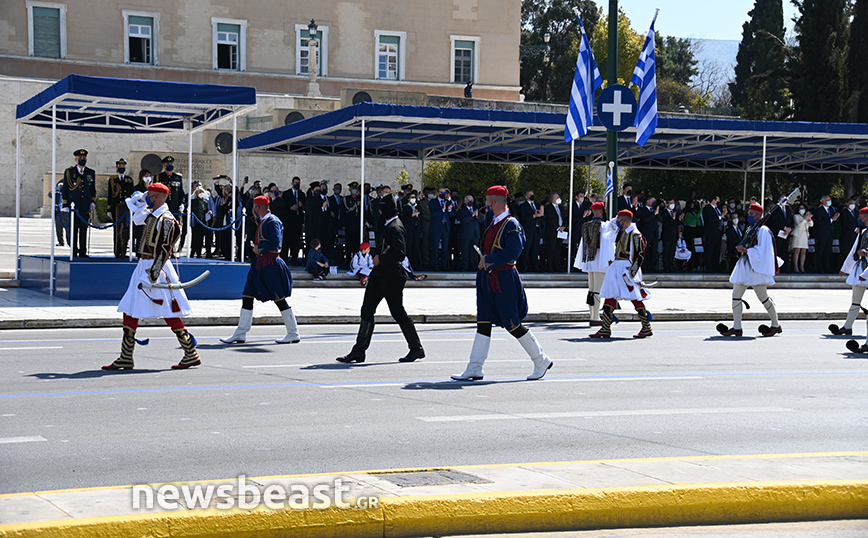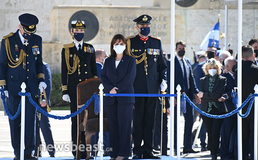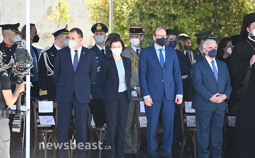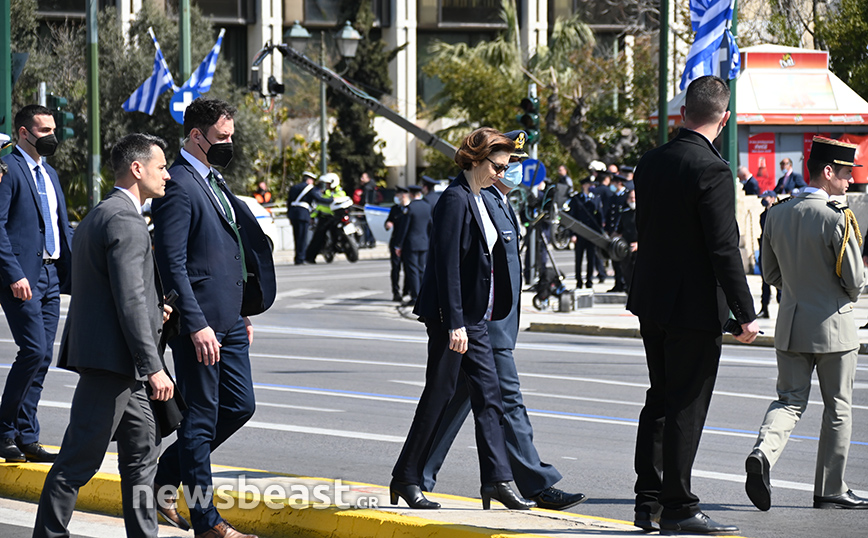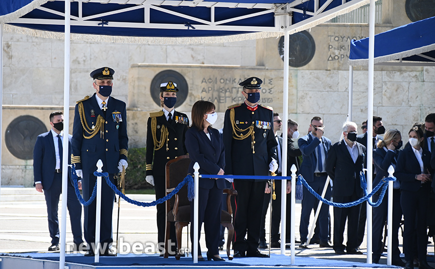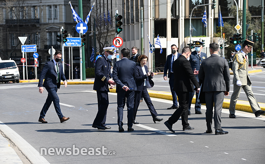 Παρόντες στο Σύνταγμα ήταν o υπουργός Εθνικής Άμυνας, Νίκος Παναγιωτόπουλος, η πρόεδρος της Δημοκρατίας, Κατερίνα Σακελλαροπούλου και η υπουργός Άμυνας της Γαλλίας, Φλοράνς Παρλί, που παρακολούθησε για δεύτερη συνεχή χρονιά την παρέλαση της 25ης Μαρτίου. Στο Σύνταγμα βρέθηκαν και 18 ναύτες από τη γαλλική φρεγάτα ALSACE.