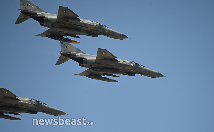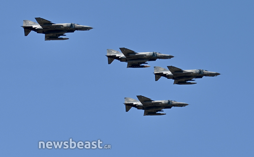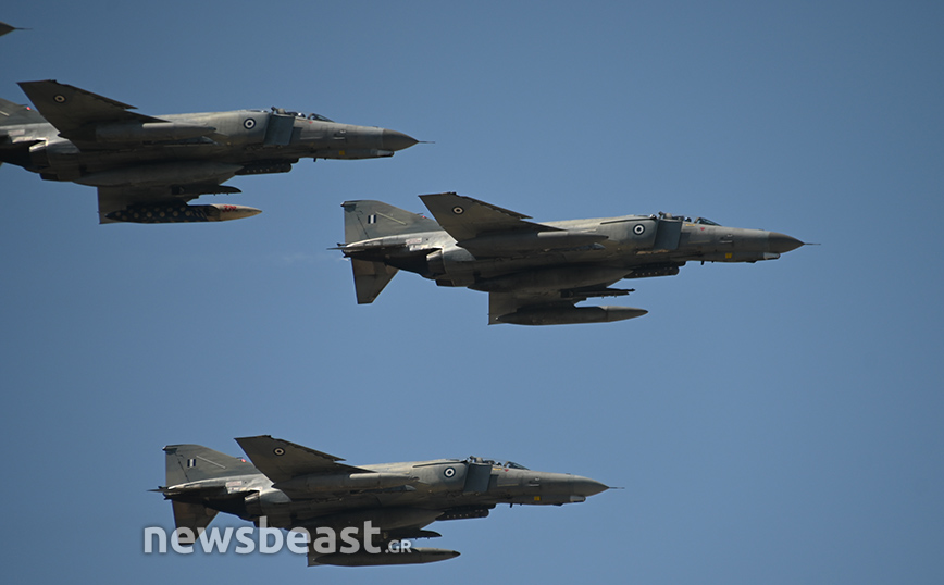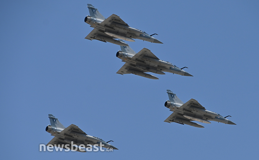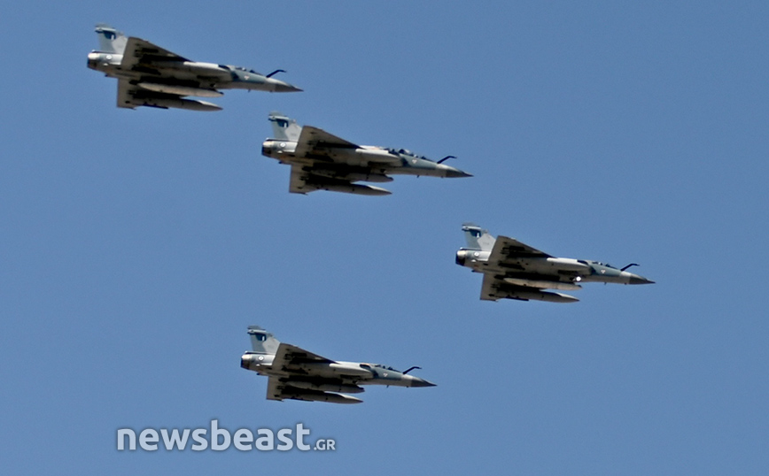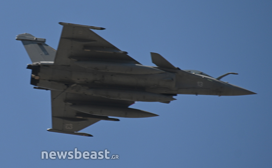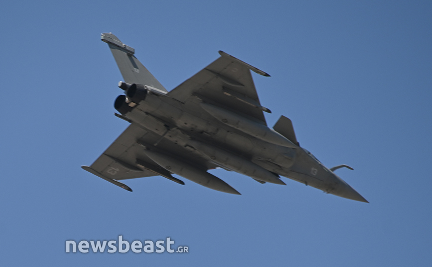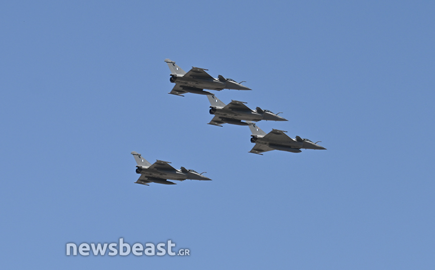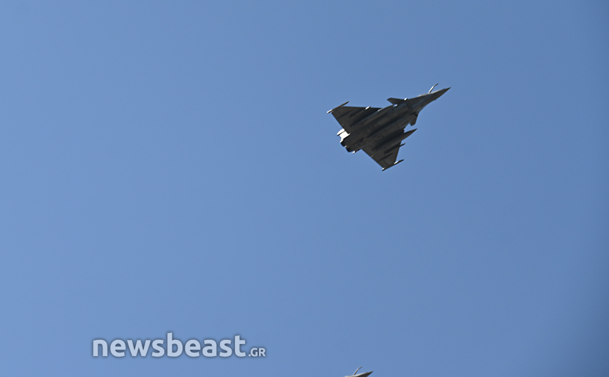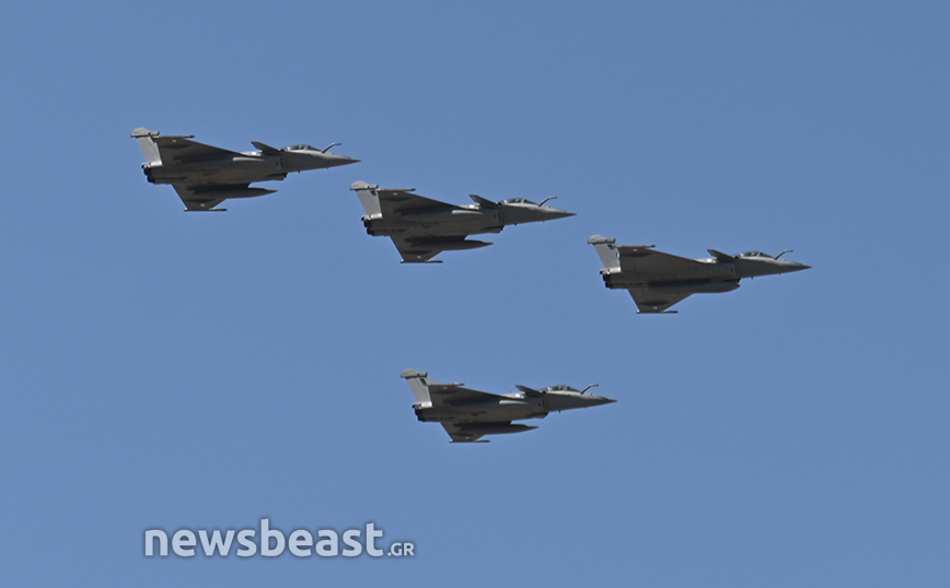 Εκτός αυτών, στον αττικό ουρανό εμφανίστηκαν άλλα τέσσερα Rafale της γαλλικής αεροπορίας, που «σηκώθηκαν» από το γαλλικό αεροπλανοφόρο Σαρλ Ντε Γκωλ.