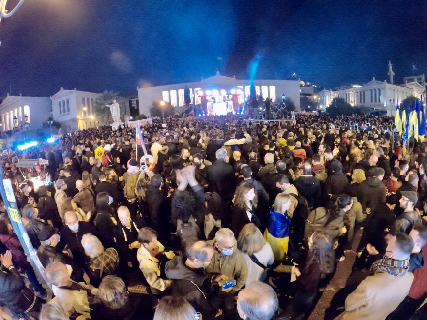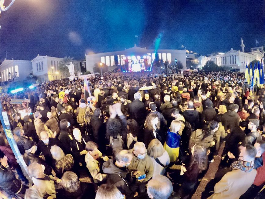 Πλήθος κόσμου βρέθηκε από νωρίς το βράδυ της Τρίτης (29/03) στα Προπύλαια για να παρακολουθήσει από κοντά τους περισσότερους από 40 καλλιτέχνες τους οποίους συμμετέχουν στην Συναυλία Ειρήνης. Το ραντεβού είχε δοθεί στις 20:00 και λίγα λεπτά μετά την προκαθορισμένη ώρα, οι πρώτες νότες ακούστηκαν.