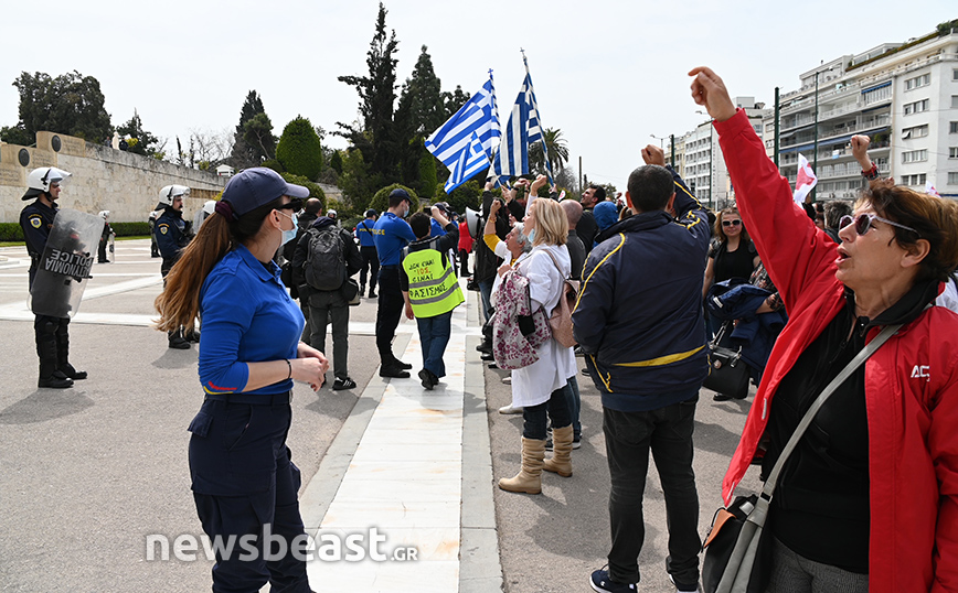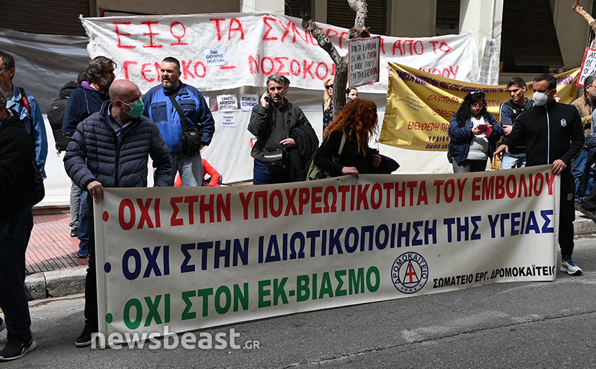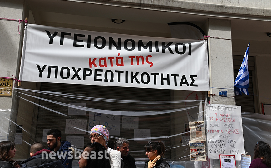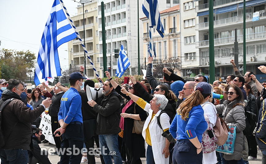 Στη συγκέντρωση που πραγματοποιείται στο Σύνταγμα εκτός από τα μέλη της ΠΟΕΔΗΝ συμμετέχουν και αντιεμβολιαστές υγειονομικοί που έχουν μπει σε αναστολή.