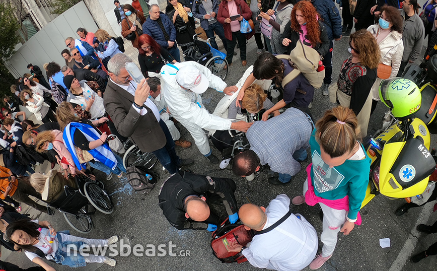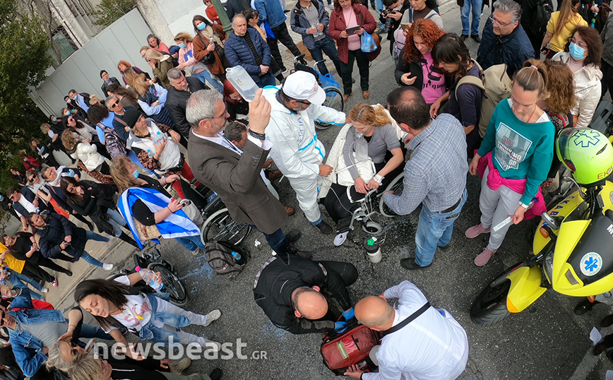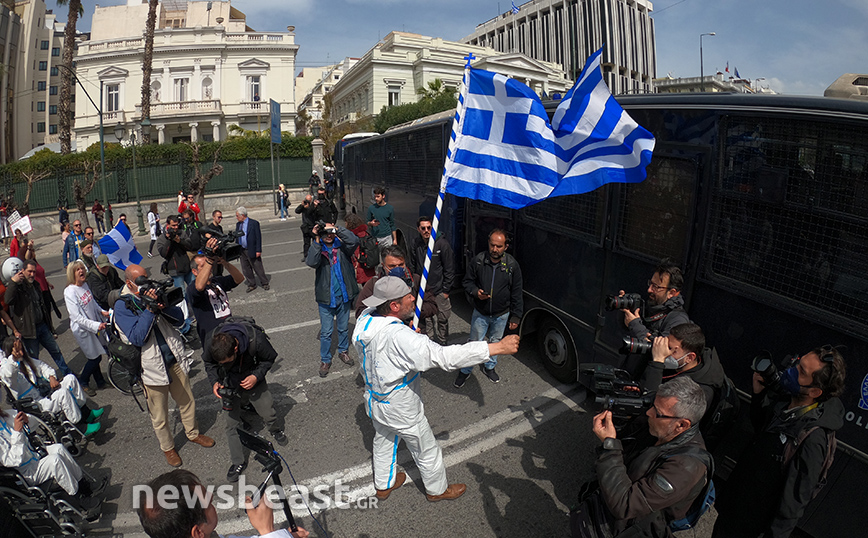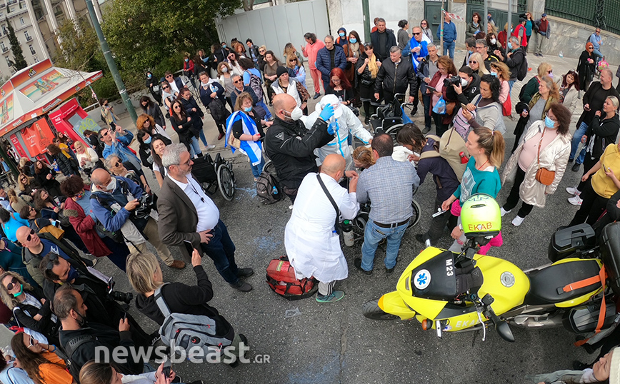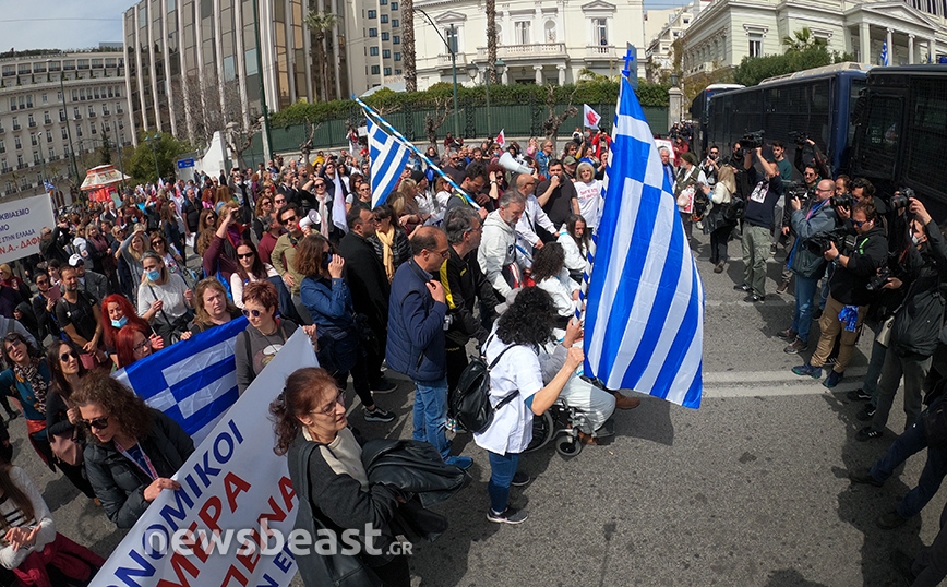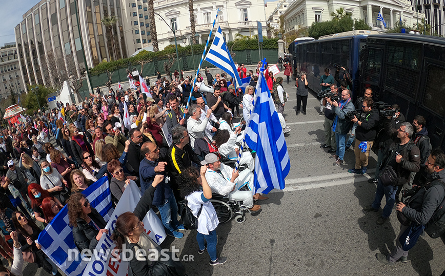 Στη συγκέντρωση που πραγματοποιείται στο Σύνταγμα εκτός από τα μέλη της ΠΟΕΔΗΝ συμμετέχουν και αντιεμβολιαστές υγειονομικοί που έχουν μπει σε αναστολή.