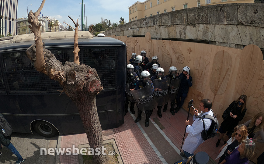 Ένταση σημειώθηκε το μεσημέρι της Τετάρτης (30/3) στο πλάγιο μέρος της Βουλής επί της Λεωφόρου Βασιλίσσης Σοφίας κατά τη διάρκεια συγκέντρωσης που πραγματοποιούν οι υγειονομικοί ενώ στο Κοινοβούλιο συζητείται το νομοσχέδιο για την Υγεία.