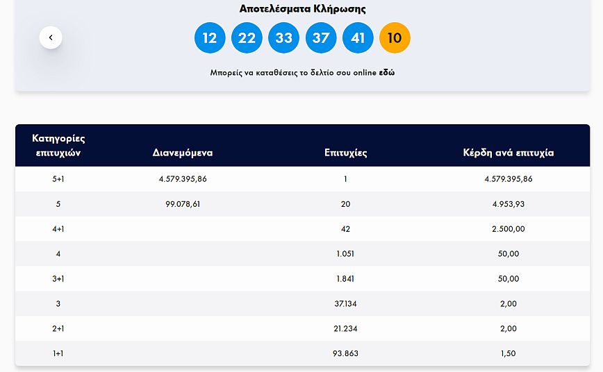 Οι τυχεροί αριθμοί στη σημερινή κλήρωση Τζόκερ είναι οι εξής: 33,12, 37, 22, 41 και Τζόκερ το 10