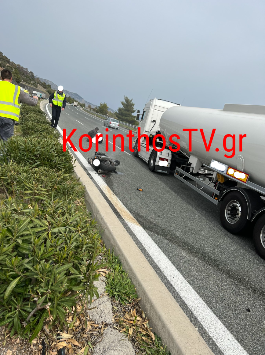 Σύμφωνα με το korinthostv.gr μία μηχανή κινούμενη από Κόρινθο προς Αθήνα, έπεσε με μεγάλη ταχύτητα στο πίσω μέρος του περιπολικού, το οποίο ήταν σταματημένο στη Λωρίδα Έκτακτης Ανάγκης για άλλο τροχαίο.