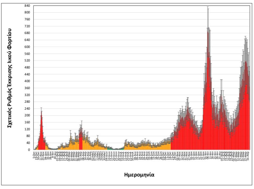 Όπως φαίνεται στα διαγράμματα που παρουσιάζει το ΑΠΕ-ΜΠΕ (επισυνάπτονται) έπειτα από περίπου έναν μήνα σταδιακής ανόδου του ιικού φορτίου και μία σταθεροποίηση κατά τις τελευταίες μέρες του Μαρτίου, από τις πρώτες μέρες του Απριλίου καταγράφεται αποκλιμάκωσή του.