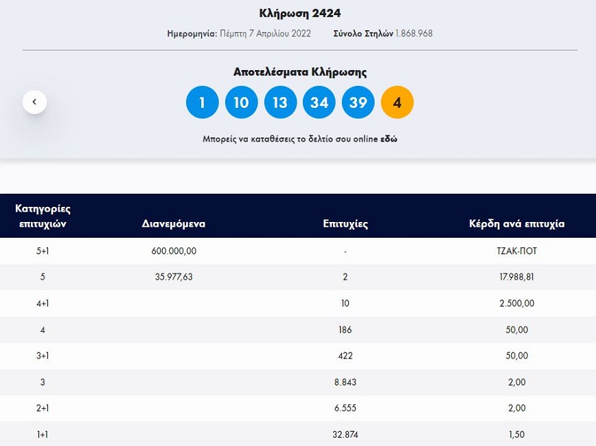 Σήμερα, Πέμπτη 7 Απριλίου 2022, στην κλήρωση 2424 Τζόκερ του ΟΠΑΠ, θα μοιραστούν στους τυχερούς της πρώτης κατηγορίας τουλάχιστον 600.000 ευρώ.