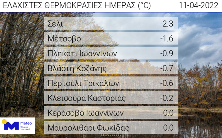 Στα ορεινά της χώρας σημειώθηκαν συνθήκες παγετού νωρίς το πρωί. Συγκεκριμένα αρνητικές θερμοκρασίες καταγράφηκαν:
