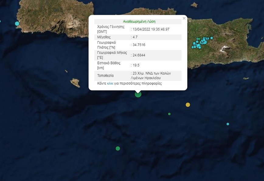 Ισχυρός σεισμός σημειώθηκε στην Κρήτη το βράδυ της Τετάρτης 13 Απριλίου. Ο σεισμός έγινε στις 22:35 με το επίκεντρο της δόνησης να εντοπίζεται στο θαλάσσιο χώρο 23 χλμ. ΝΝΔ της πόλης των Καλών Λιμένων Ηρακλείου.