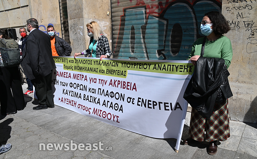 Άμεσα μέτρα για την ακρίβεια, κατάργηση των φόρων και πλαφόν σε ενέργεια, καύσιμα και βασικά αγαθά, καθώς και αύξηση στους μισθούς, ζητούν εργαζόμενοι του υπουργείου Ανάπτυξης που πραγματοποιούν αυτή την ώρα συγκέντρωση διαμαρτυρίας στην πλατεία Κάνιγγος.